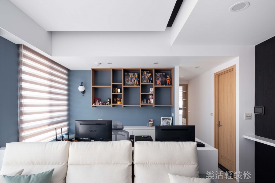 屋主是自由工作者,在家時間很長,並且需要完整的工作空間,配置重點擺放在客廳和書房的共同區域,同時在這個區域有收納及展示需求;風格上則選擇耐看的現代簡約風,不過於凌亂的線條能幫助屋主在工作時思路更清晰。