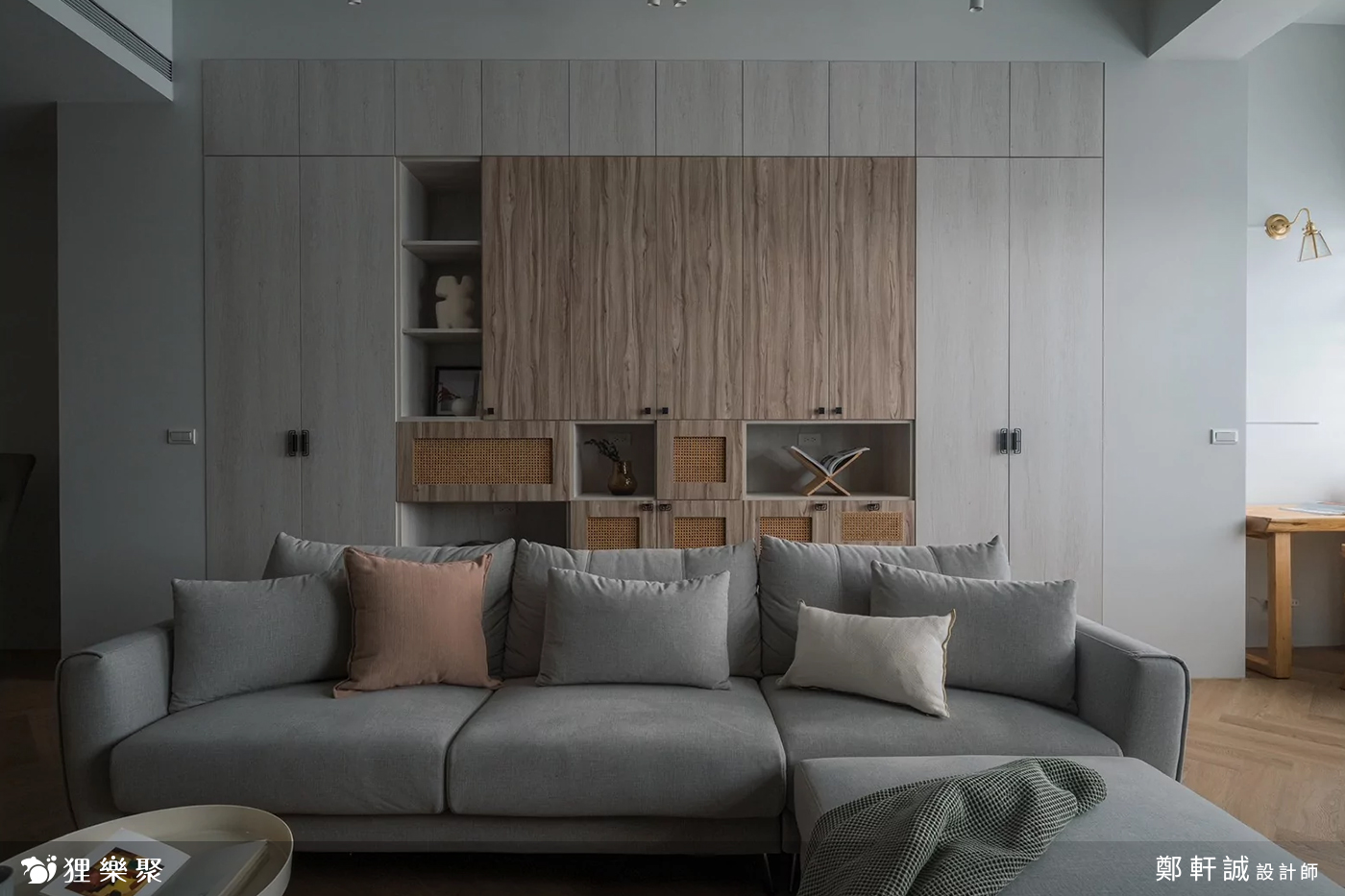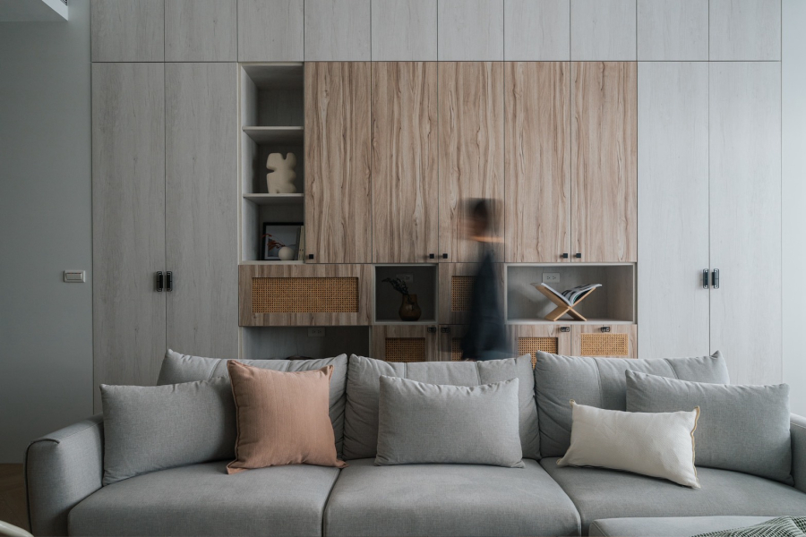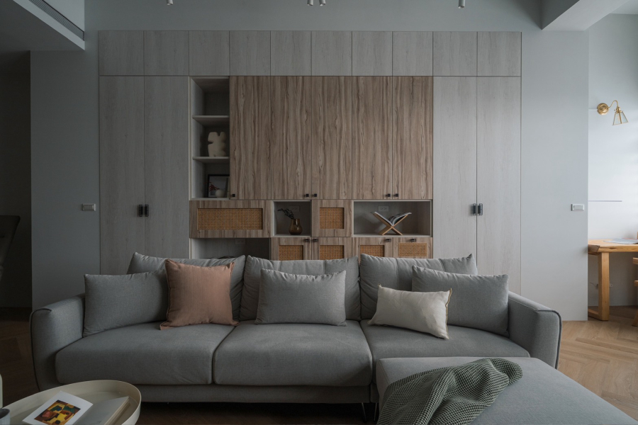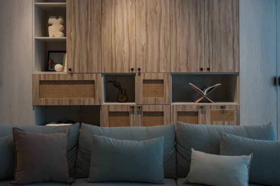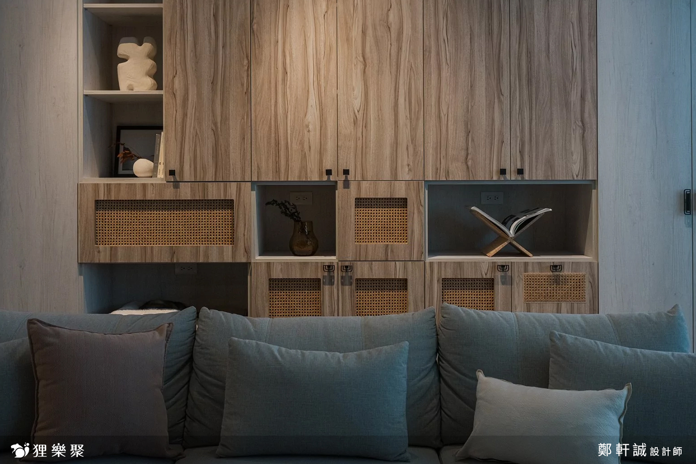 沙發背後的系統櫃搭配訂製手工藤編門板,為日常收納提供結合收納與美感的強大機能,牆面層次與光影交織,使客廳成為家庭互動的溫柔核心。