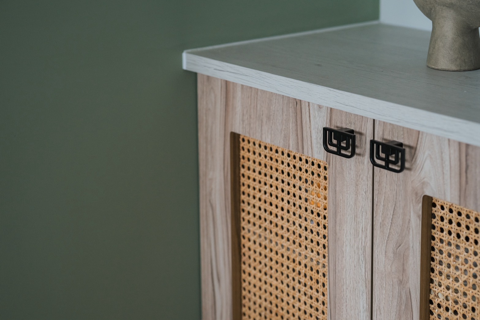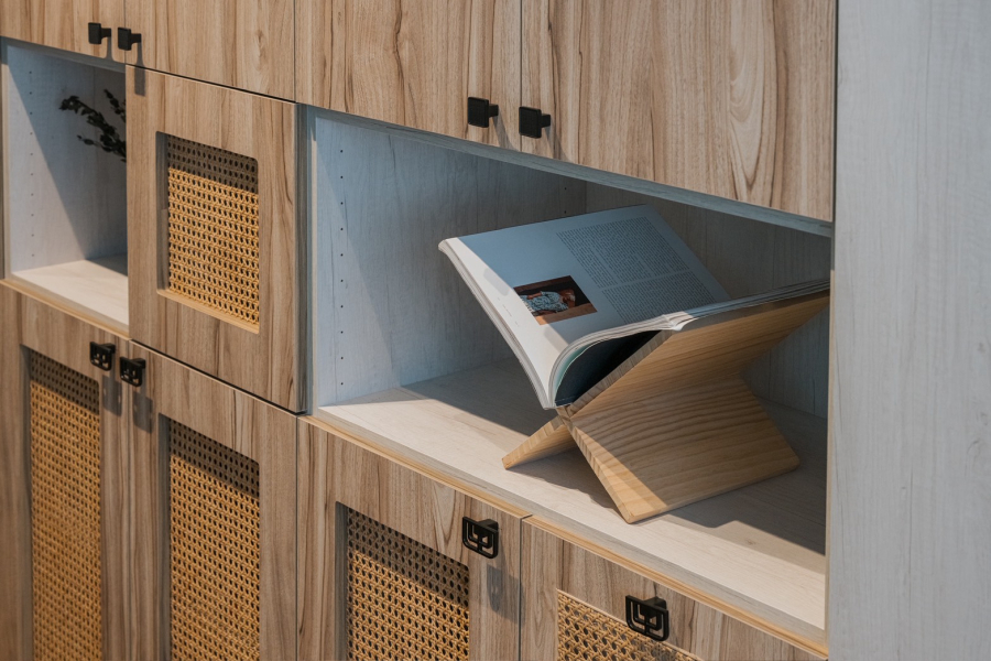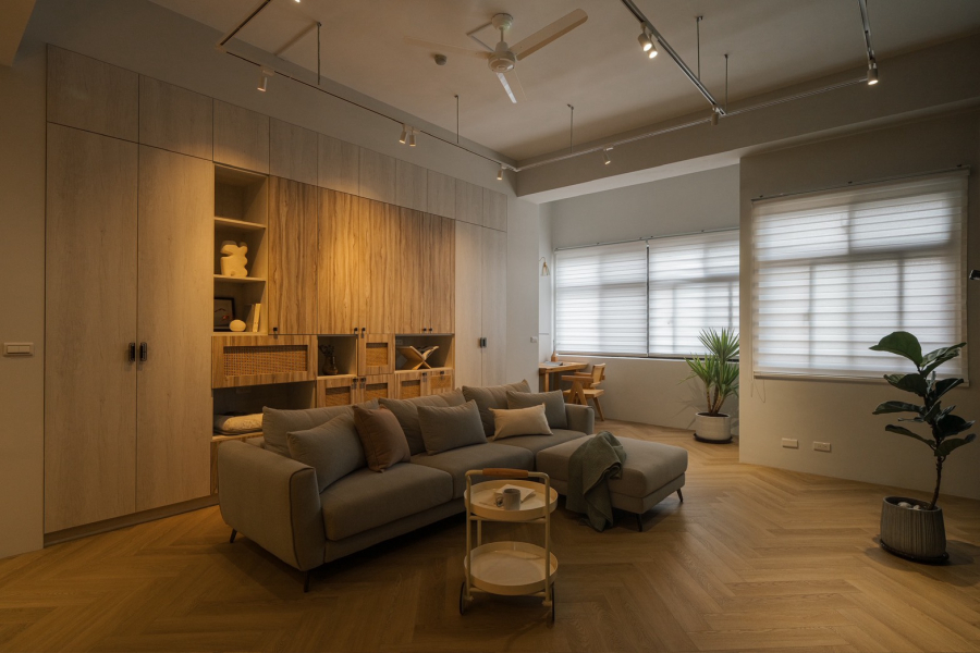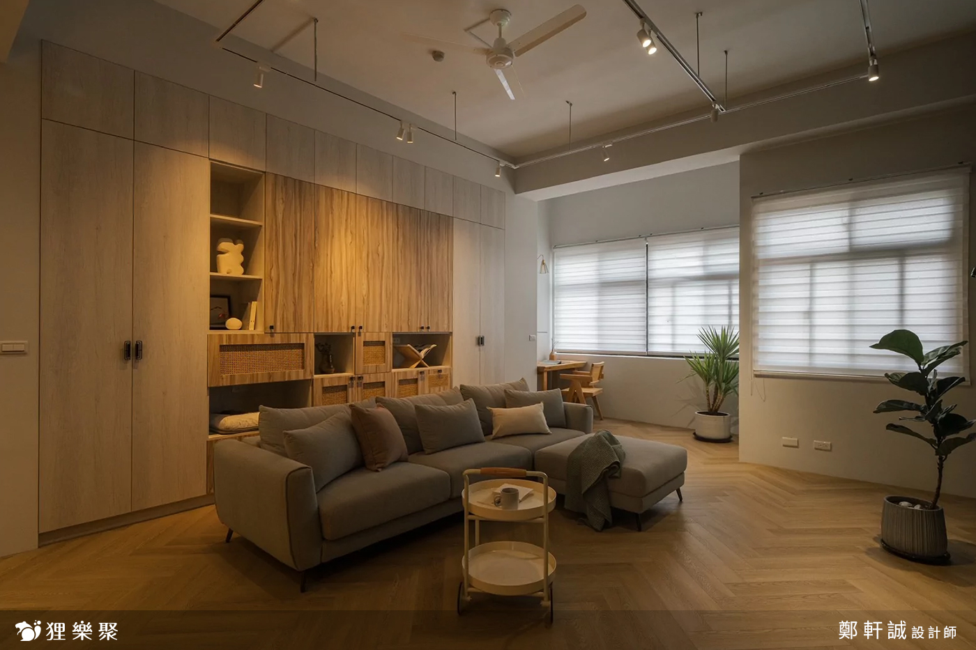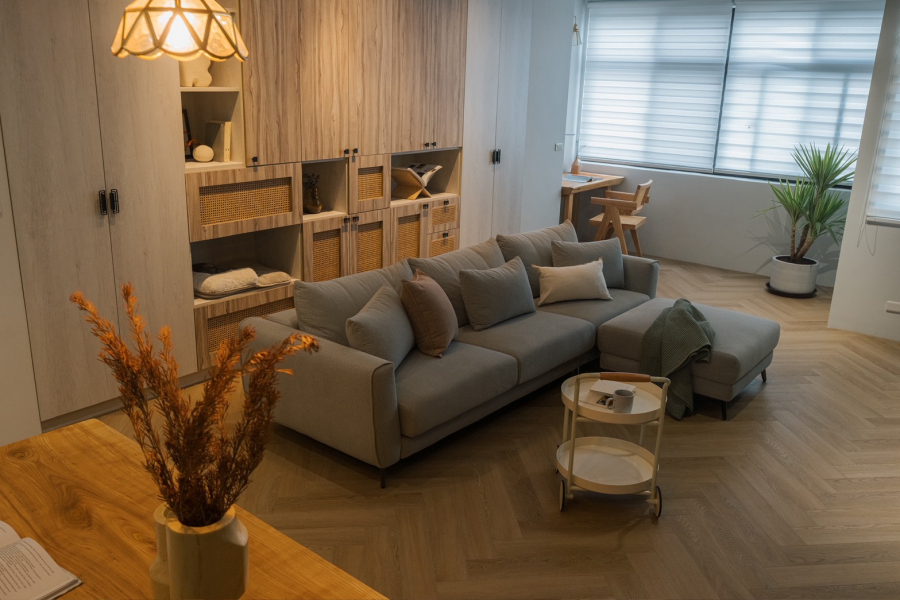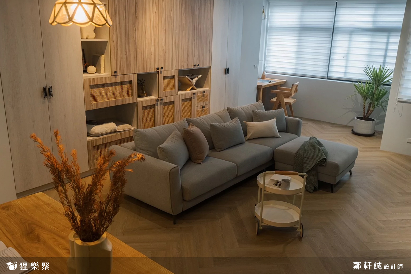 沙發背後的系統櫃搭配訂製手工藤編門板,為日常收納提供結合收納與美感的強大機能,牆面層次與光影交織,使客廳成為家庭互動的溫柔核心。