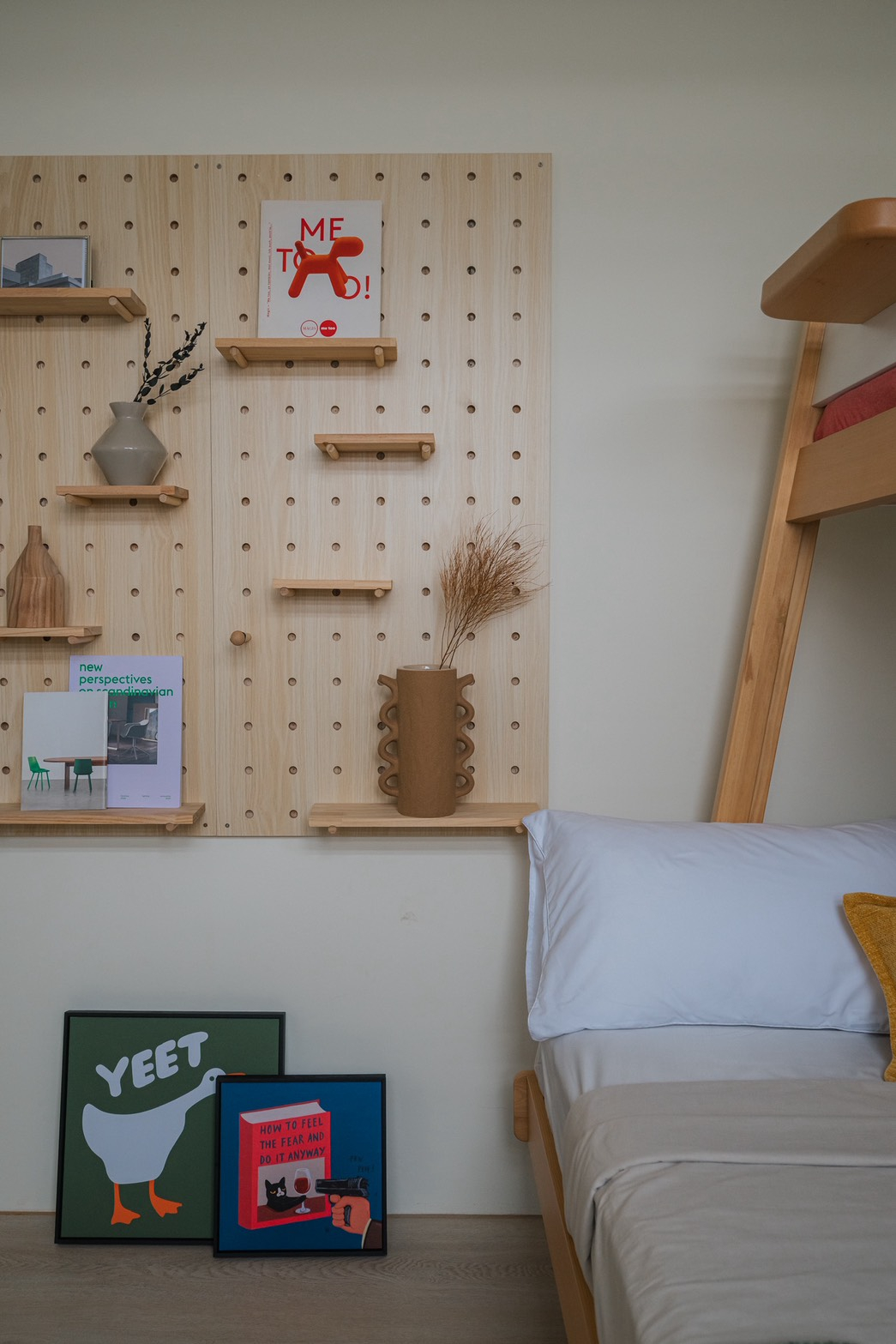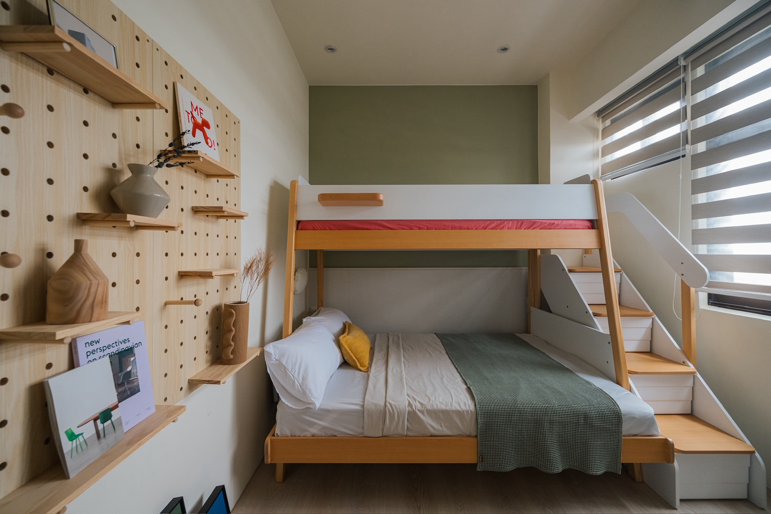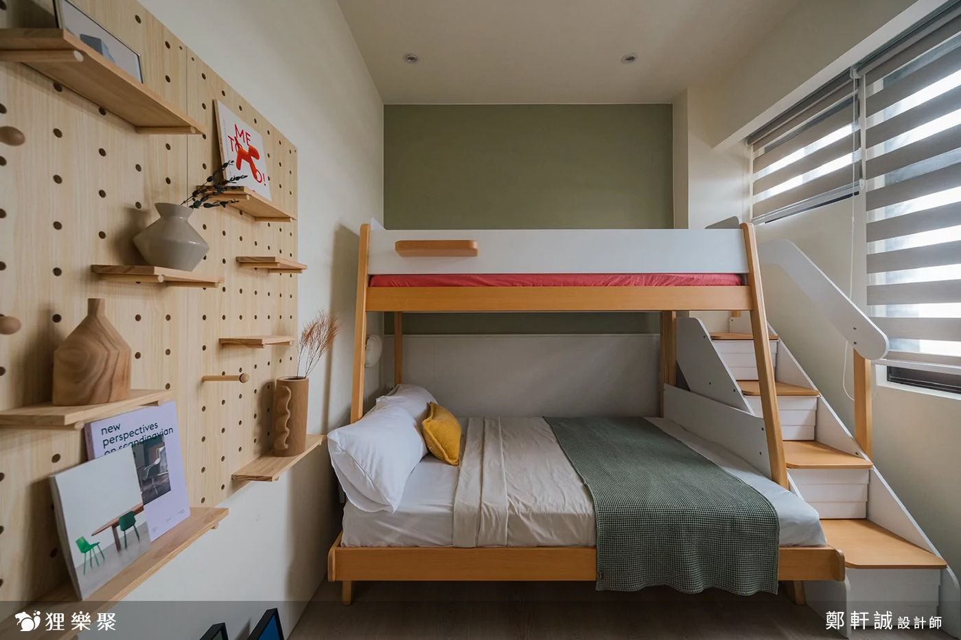 兒童房則跳脫制式設計,採活潑的綠色與多功能洞洞板結合,創造孩子專屬的遊樂天地。衛浴以進口手工窯烤磚鋪陳,融合復古地磚的白色基調,並規劃乾濕分離,不僅清潔方便也兼具安全性。