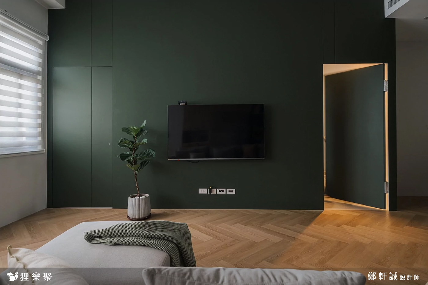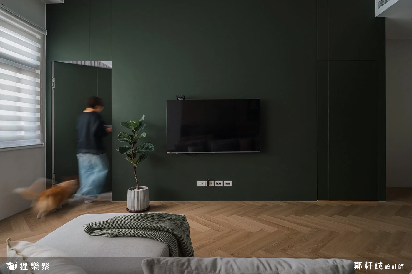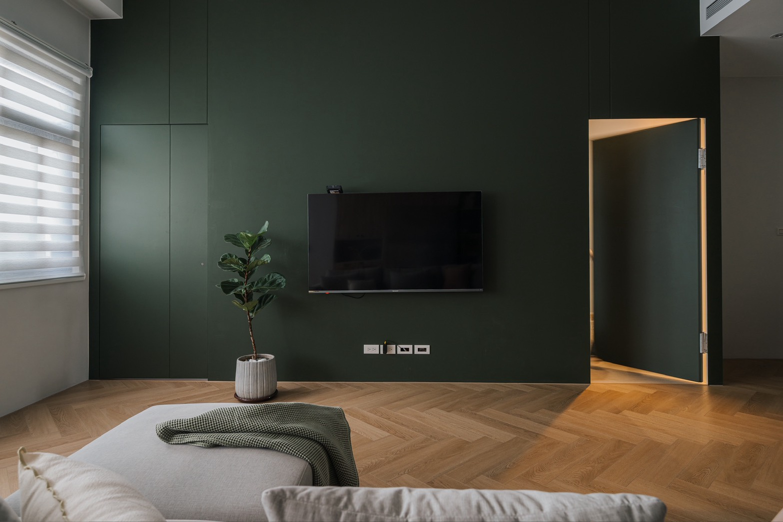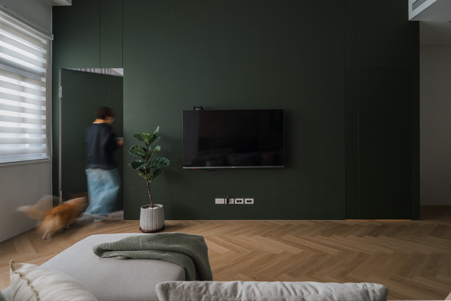 客廳融合復古與現代語彙,鋪上人字拼耐磨木地板,映襯大面積的綠色跳色電視牆、軌道燈,呈現穩重且有層次的空間感。窗邊則特別預留書桌區,在陽光灑落的角落創造出如咖啡館般的閱讀場域,使屋主能陪伴孩子自在學習與成長。沙發背後的系統櫃搭配訂製手工藤編門板,為日常收納提供結合收納與美感的強大機能,牆面層次與光影交織,使客廳成為家庭互動的溫柔核心。