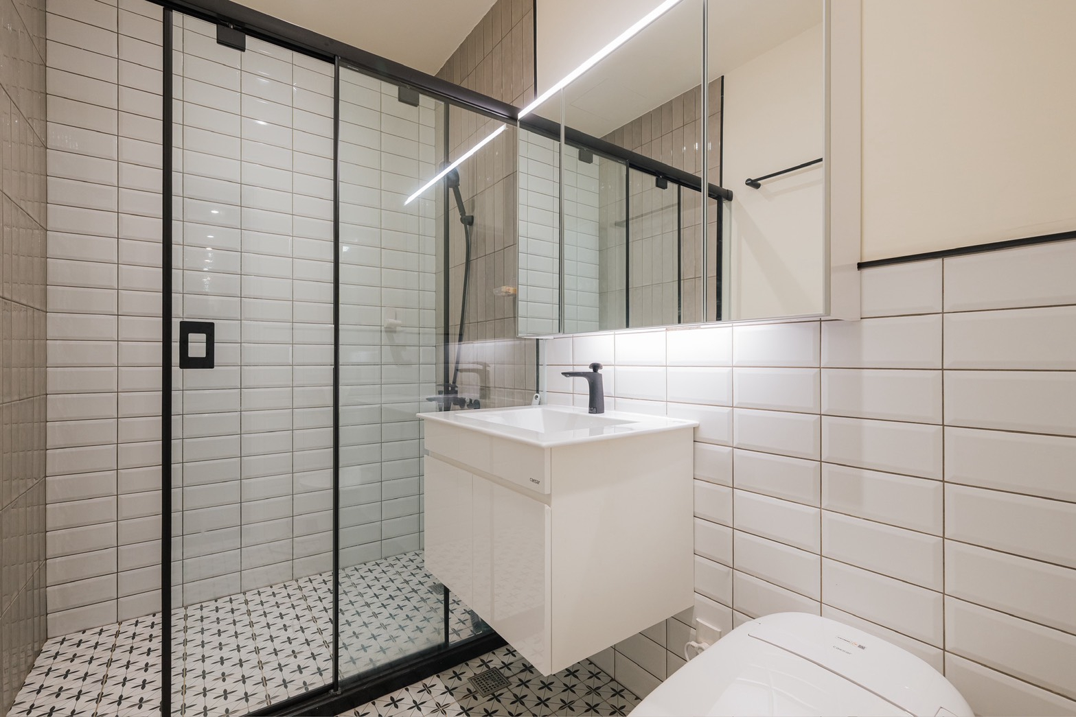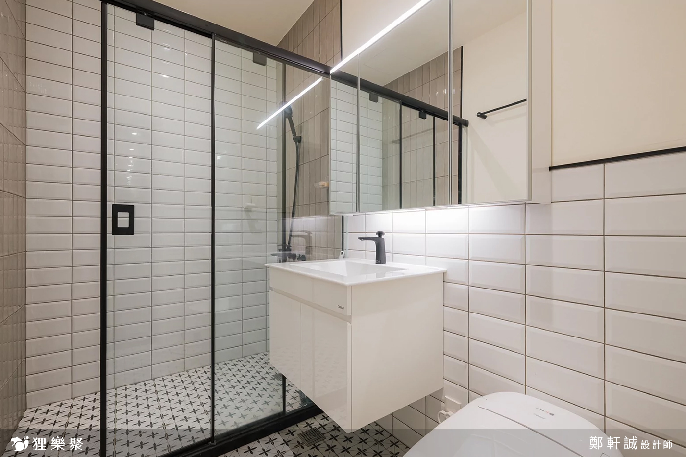 主臥室劃分為休息區與更衣室,設計師挑選了靜謐的藍色牆面,搭配開放式衣櫃串連層次,不僅滿足夫妻更衣需求,也將先生的吧檯式書桌巧妙融合其中,保留個人專屬的工作與閱讀時光。兒童房則跳脫制式設計,採活潑的綠色與多功能洞洞板結合,創造孩子專屬的遊樂天地。衛浴以進口手工窯烤磚鋪陳,融合復古地磚的白色基調,並規劃乾濕分離,不僅清潔方便也兼具安全性。