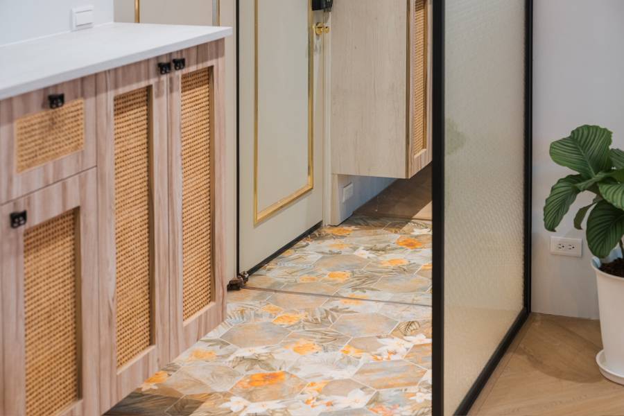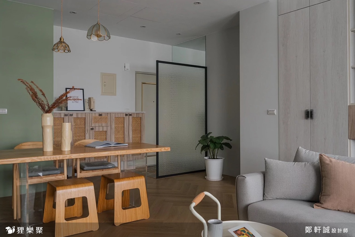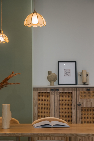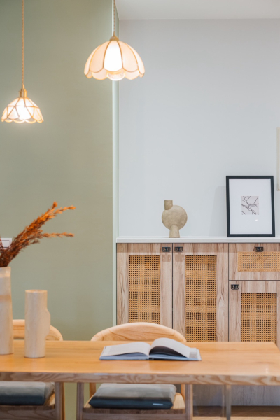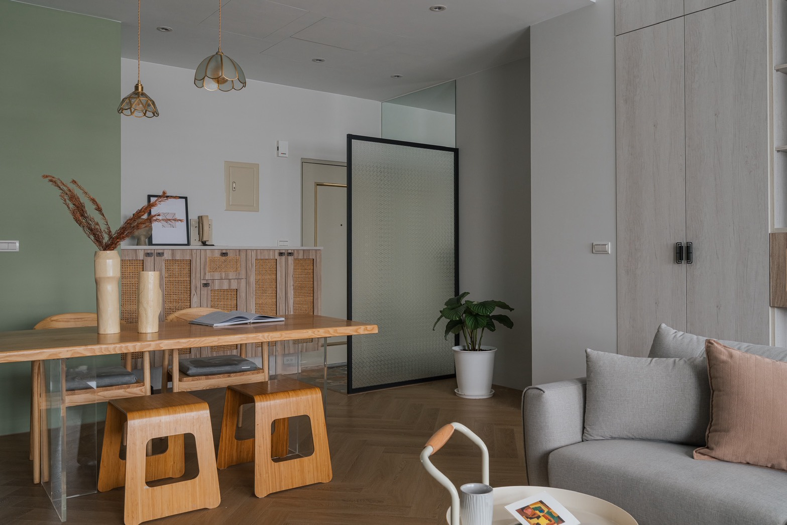整體風格融合沉穩的中式配色,與陽光開放的美式鄉村元素,襯上綠色牆面、復古花磚、藤編元素與系統櫃等設計細節,交織出舒適且溫潤的生活氛圍,為讓每個空間獨立發揮最大價值。