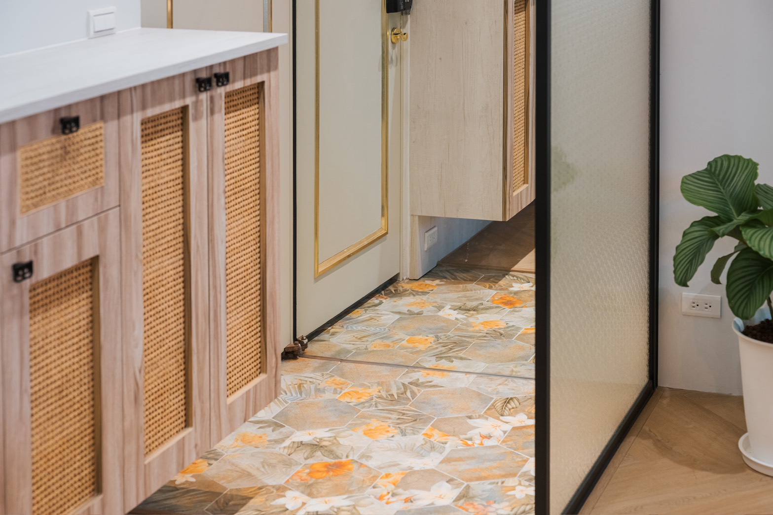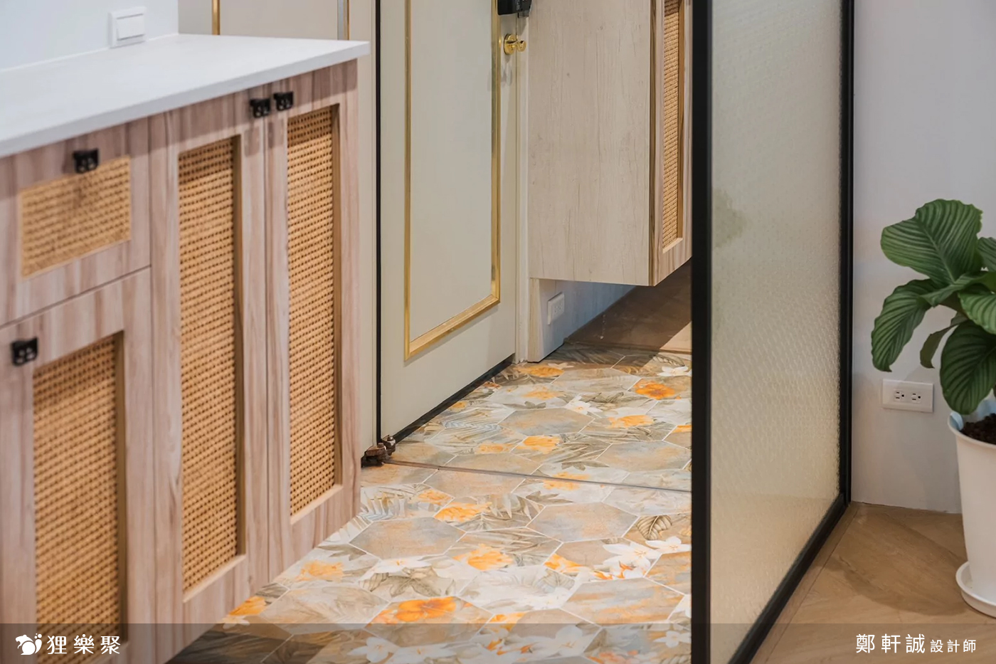 一進門,玄關落塵區的六角花磚映入眼簾,訂製手工藤編門板系統櫃,兼具收納與美觀。進口花磚散發淡淡復古氣息,襯上復古海棠花鋁框玻璃屏風,營造出帶有儀式感的迎賓動線。廚房採用全白五面結晶鋼烤廚具設計,簡潔俐落的線條與高質感材質,與整體復古鄉村風形成美麗對比,讓烹飪成為享受生活的一部分。餐廳選用蘋果綠的跳色牆面,搭配木質餐桌餐椅與花型燈具,流淌出鄉村風的溫暖氛圍,不論用餐、工作或夜晚小酌都非常適合。