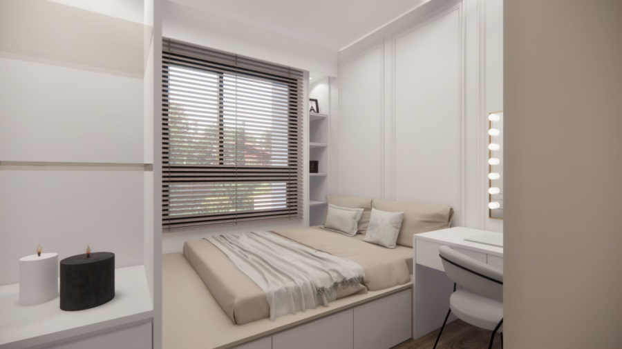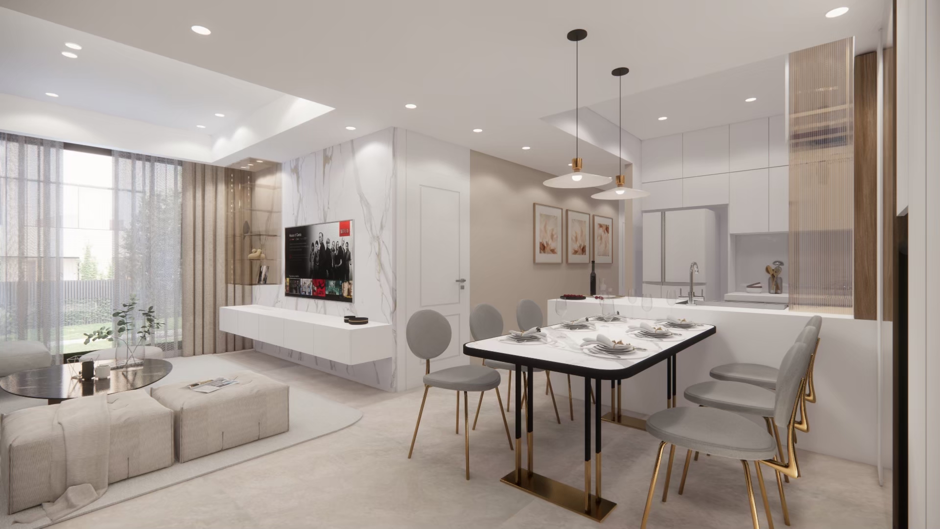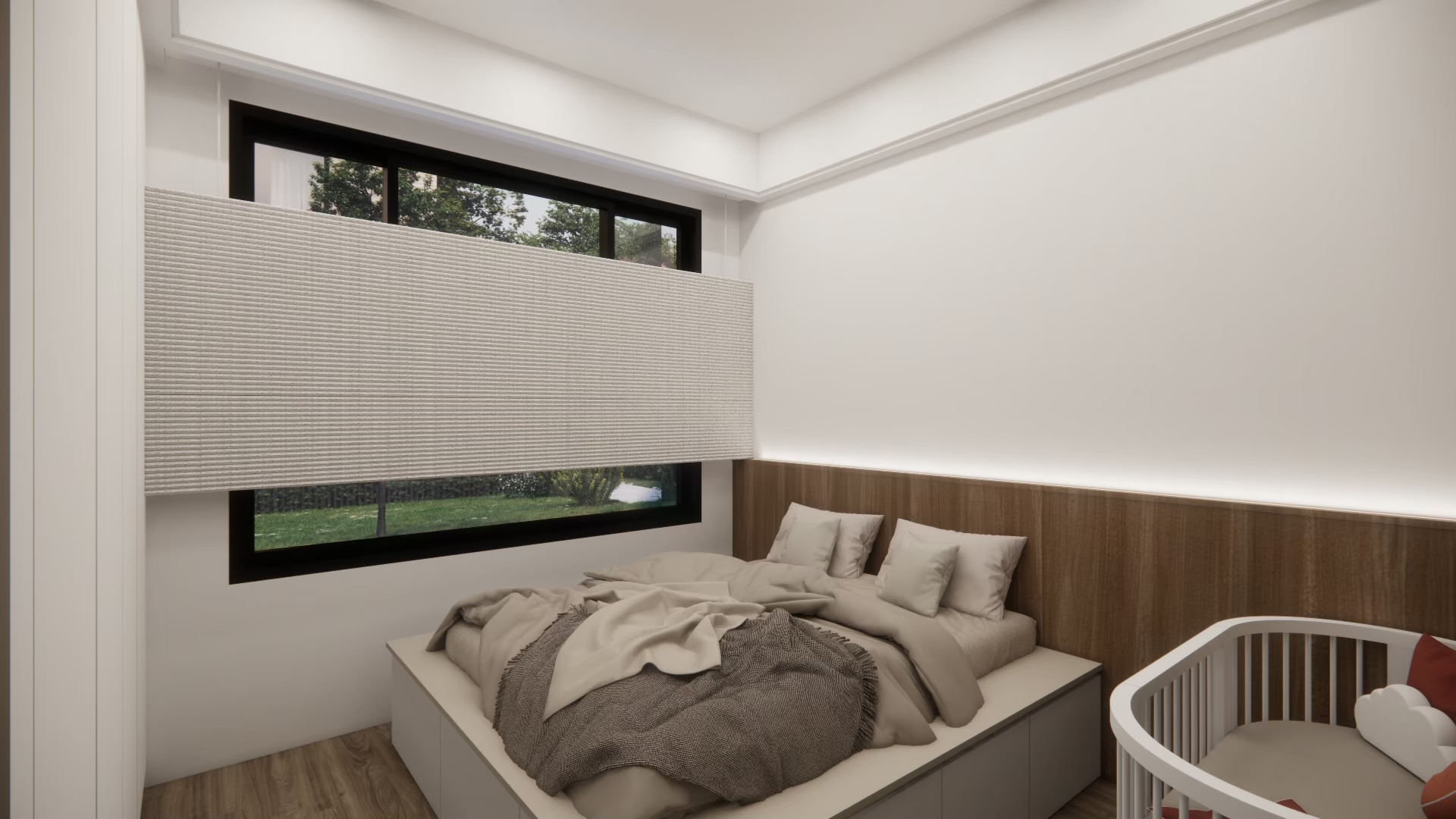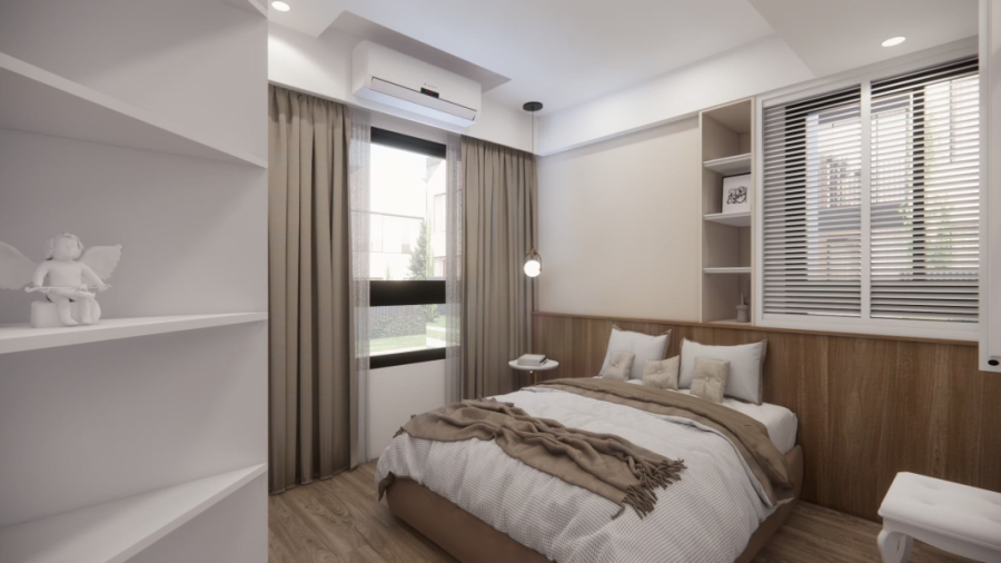 在白與木的冷靜基調中,局部注入奶茶色織品與家具軟裝,讓整體氛圍更溫潤柔和。