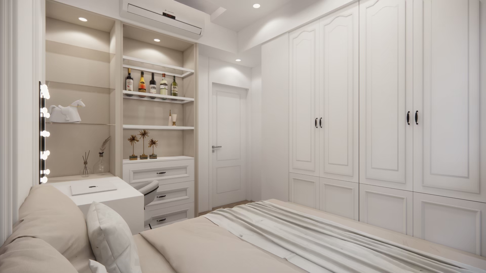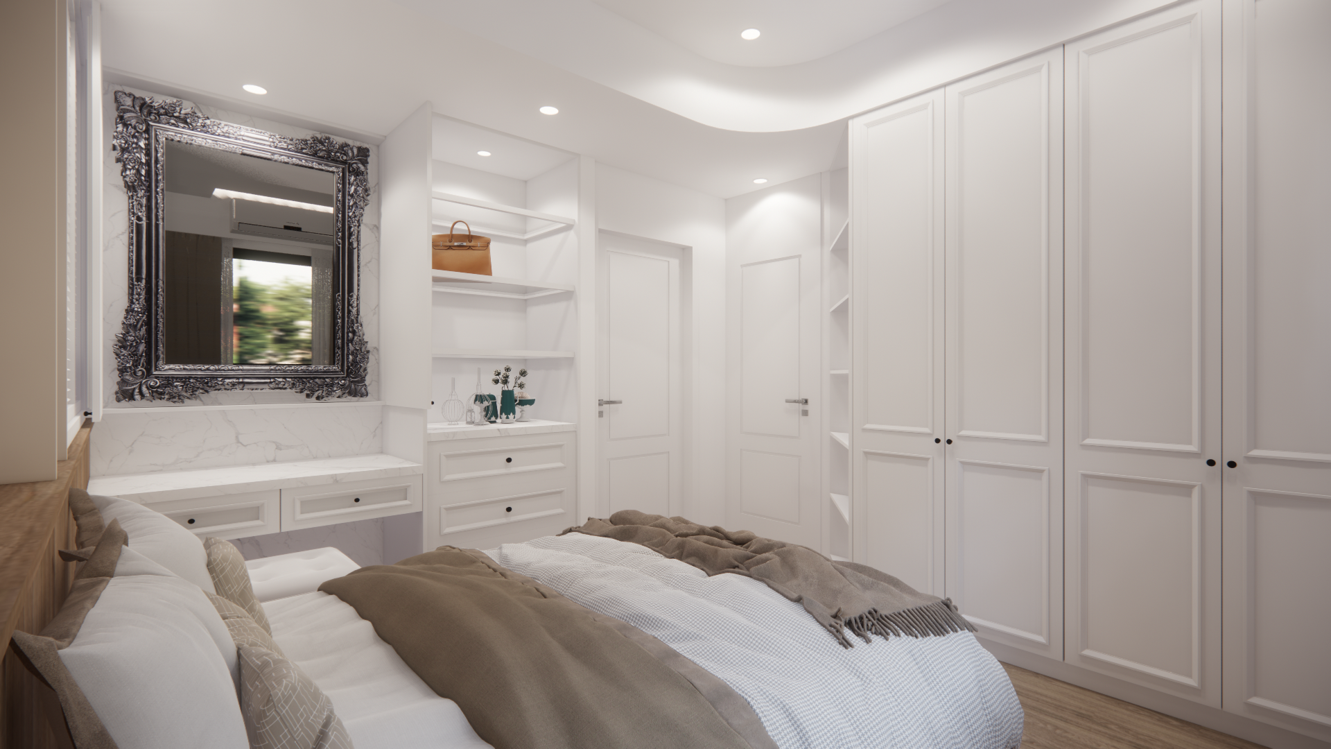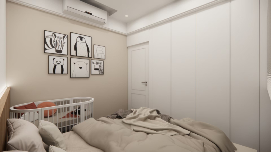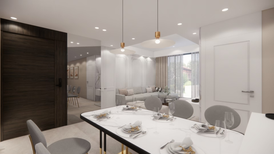 在白與木的冷靜基調中,局部注入奶茶色織品與家具軟裝,讓整體氛圍更溫潤柔和。