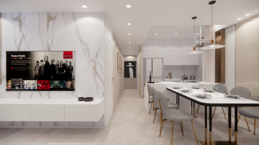 天花板不使用傳統層次造型,而改以燈光語彙打造光影層次,讓視覺簡潔同時保有設計細節。