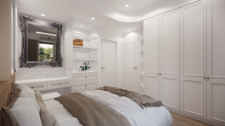 為讓雙方需求取得平衡,整體風格調整為現代美式,以白色線板語彙結合俐落立面比例作為主軸,搭配重木色的櫃體框架,強化穩重感與空間層次。