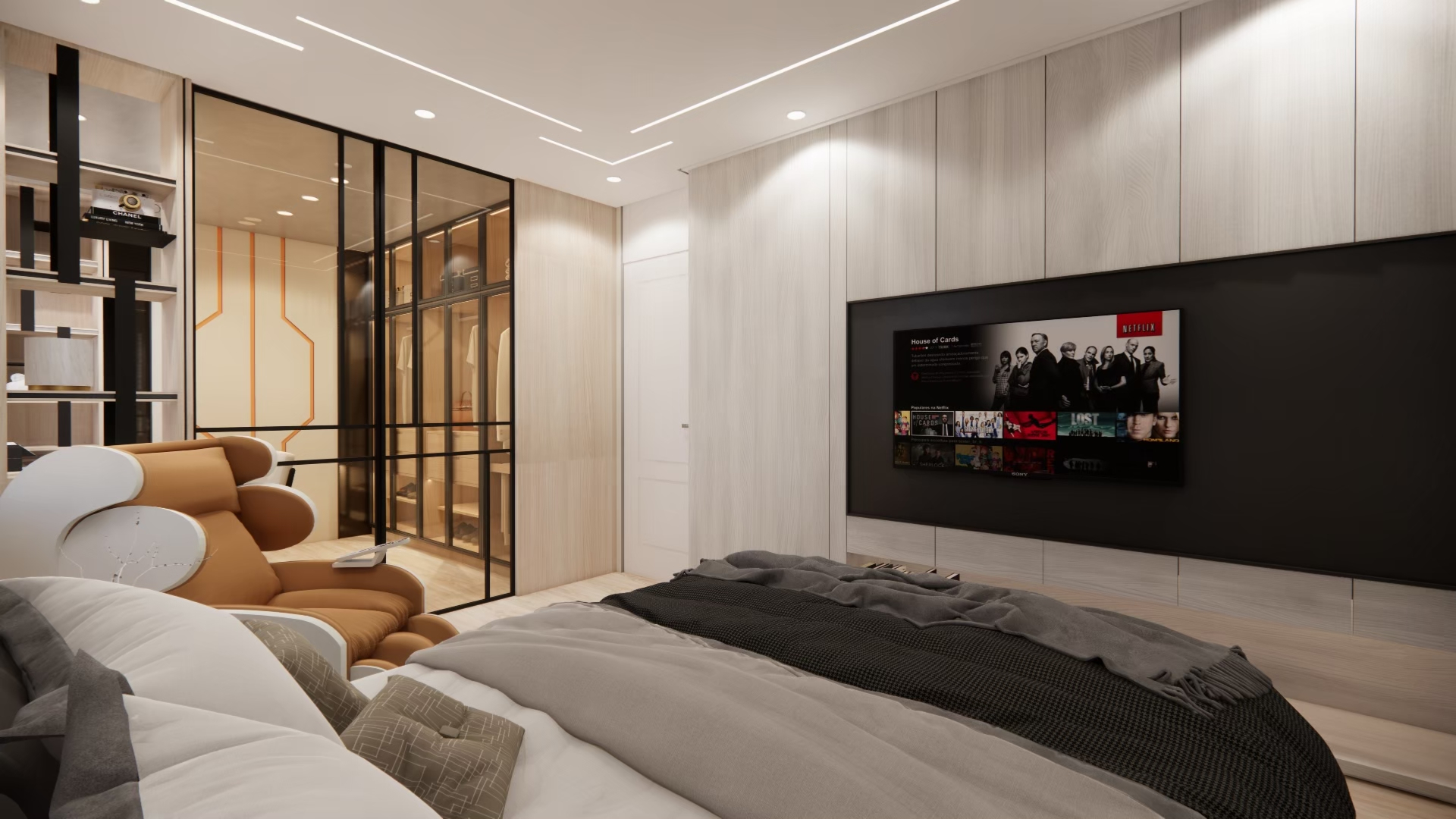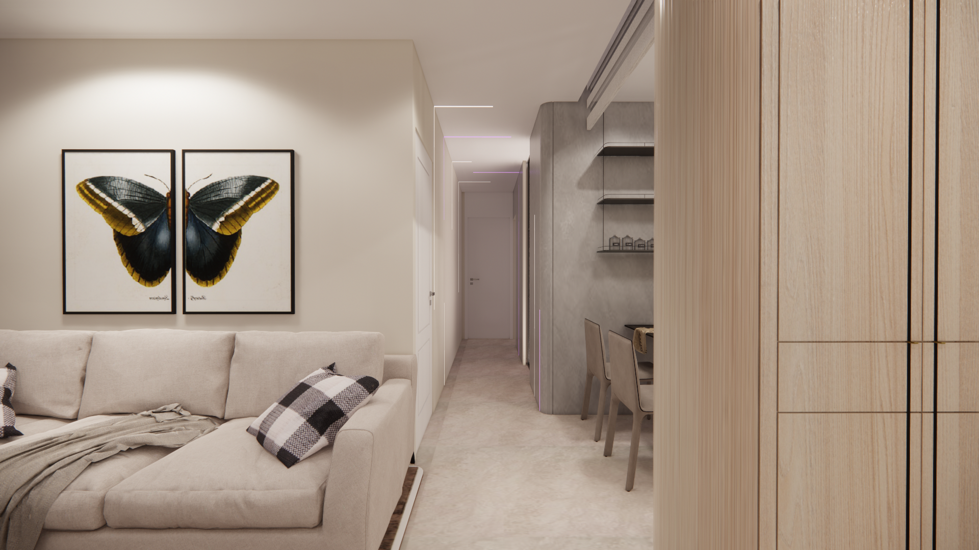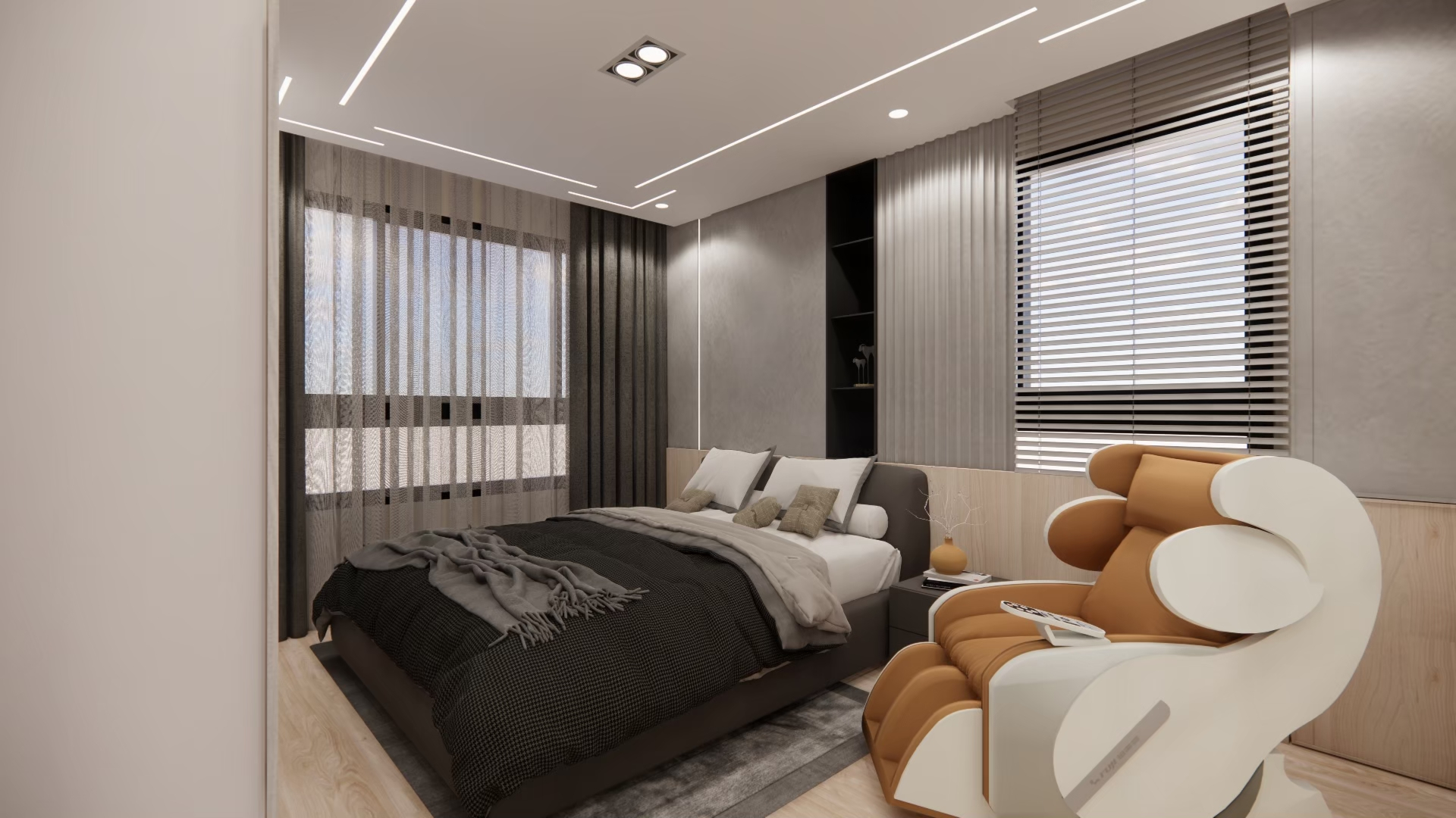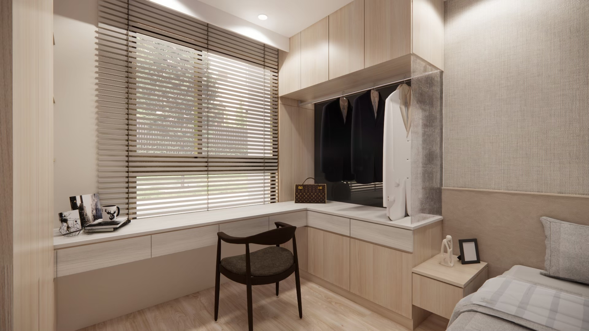 設計理念:屋主希望空間簡單明亮、風格俐落,因此整體以淺色系為主,搭配線條感與光影層次強化視覺效果。