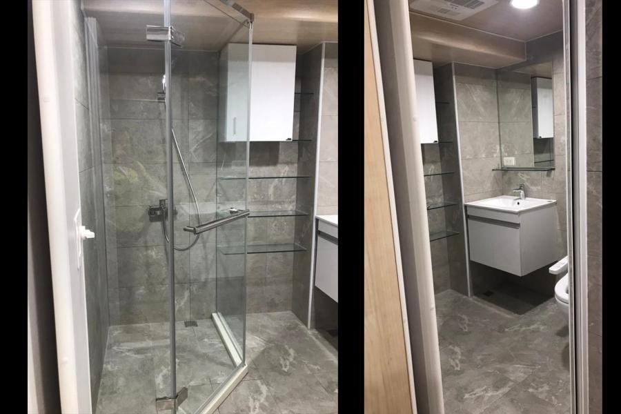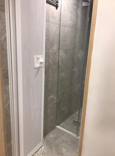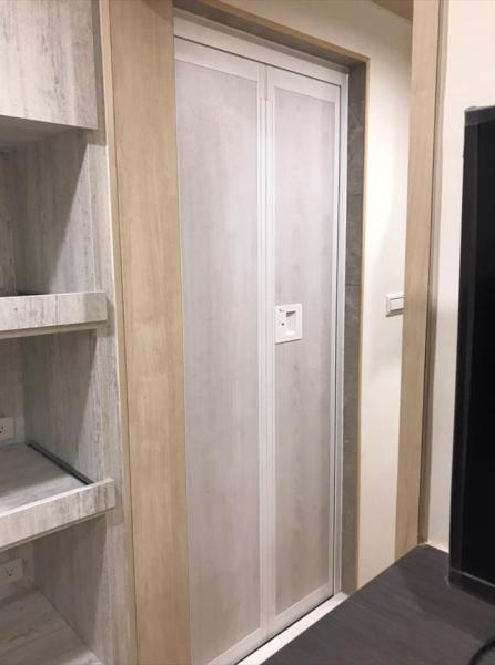 ◆浴室傳統門扇大小影響動線與使用空間,透過改造為時尚大方的折門,讓浴室入口不再尷尬,也擴大了空間運用。