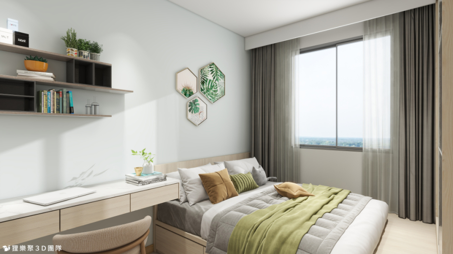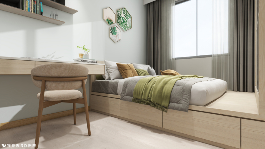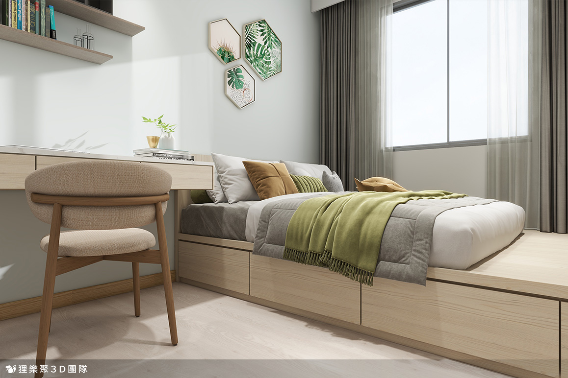 ▲ 次臥室以莫蘭迪綠為主調,臥榻下設置收納空間