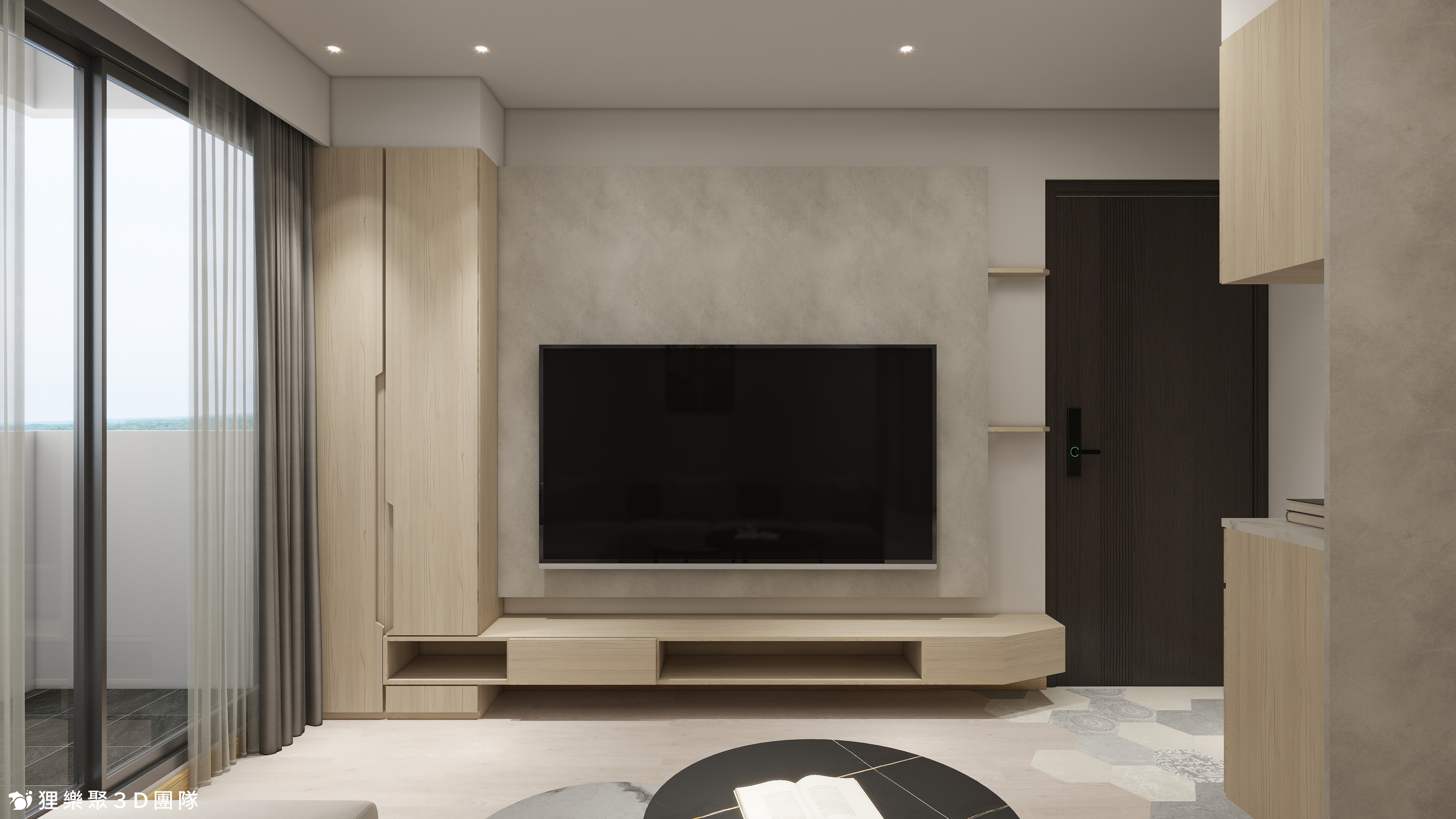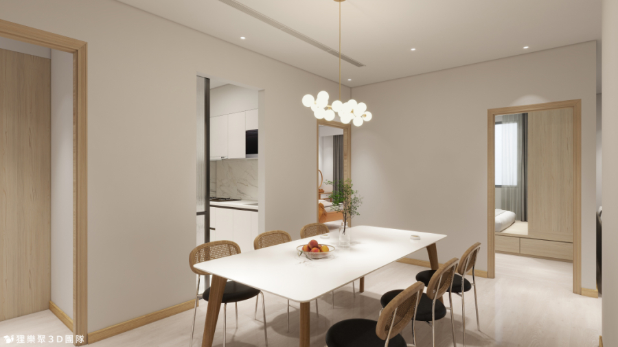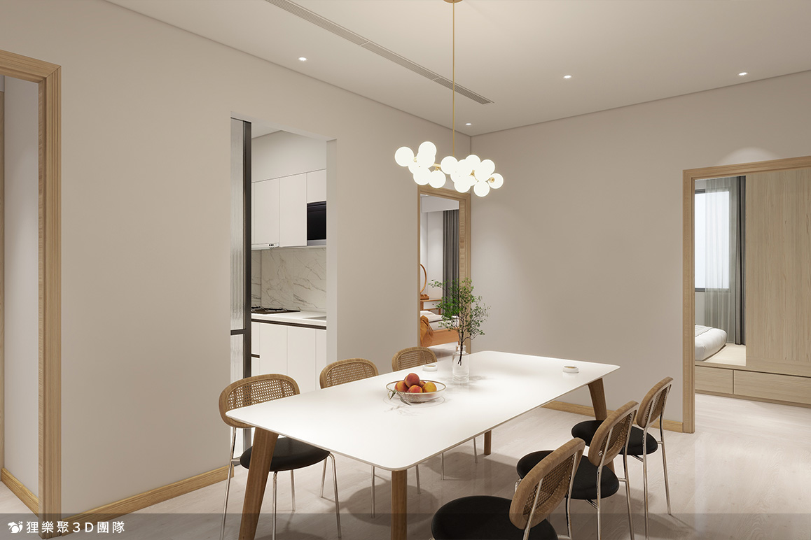 本案玄關進門處與電視牆位於同一平面,設計師利用中段、底部鏤空的玄關櫃搭配六角磚隔出落塵區,能暫放物品、收整鞋具,即使坪數不大也能有好用的高機能玄關。客廳電視牆以淺木紋、低飽和灰色調搭配,並特別在轉角規劃了防撞設計,提升居家安全性的同時也帶出溫暖舒適的氛圍,餐廳空間能容納至少6人,就算親友來訪人數再多也能寬敞自在。