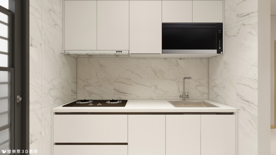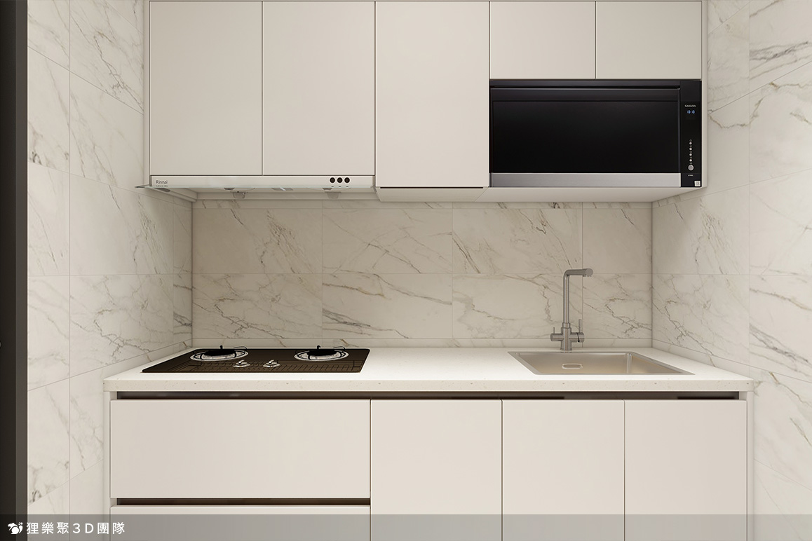 廚房區域以帶有質感的石紋防濺板、牆面搭配上白色廚具門片,創造好清理、好收納的下廚空間,讓屋主每天做飯都有好心情。