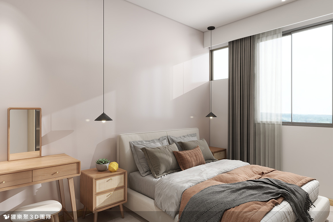 主臥室以莫蘭迪粉漆上床頭,襯上木紋、白色系搭配出無印風格的純淨感受,設計師於衣櫃局部以長虹玻璃拉門取代門片,讓衣物好拿好找,營造放鬆舒適的睡眠氛圍。次臥室則以莫蘭迪綠為主調,並規劃了木質臥榻增加收納量,滿足儲物機能的同時也省下購買床架的花費,提升整體坪效。