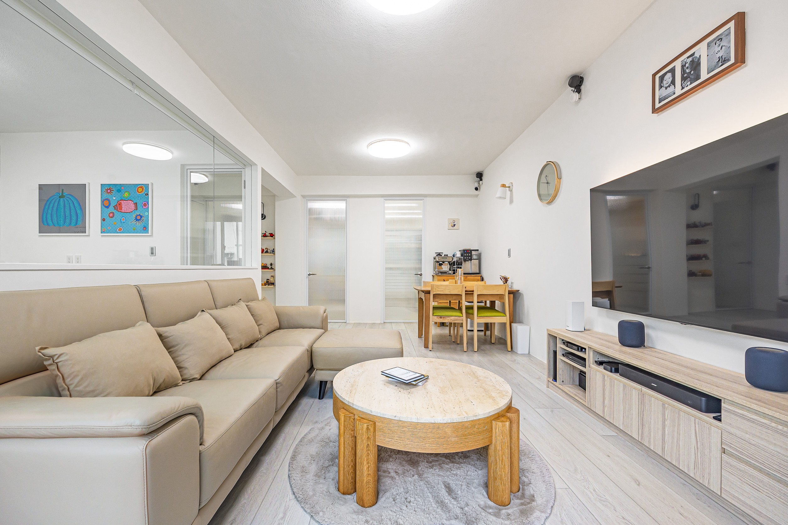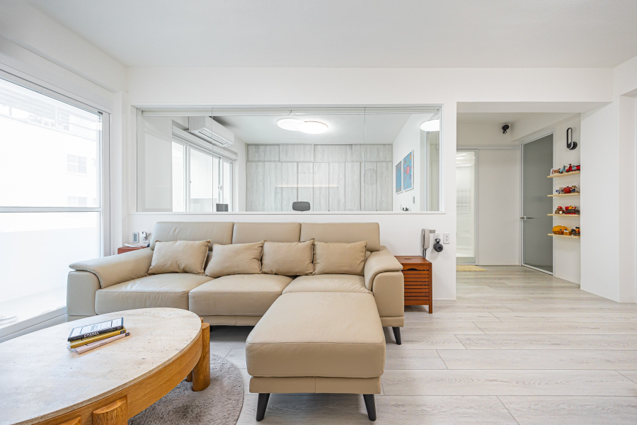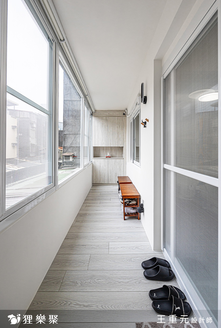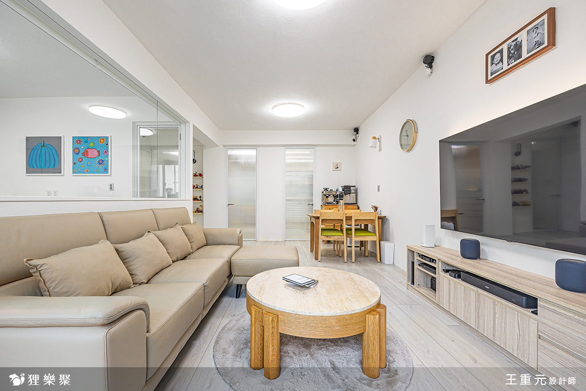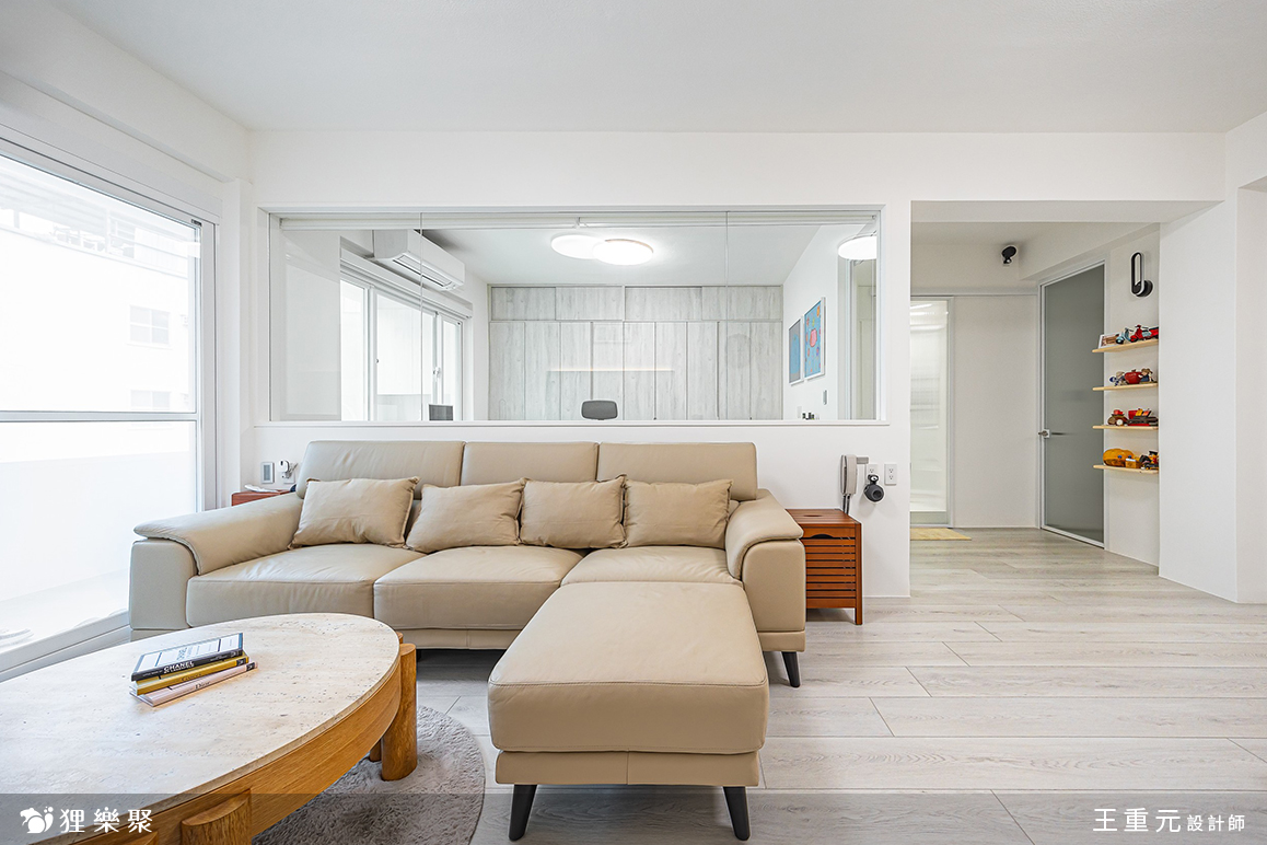 為了給子女更好的生活環境,屋主找上狸樂聚翻新這間屋齡13年的舊屋,設計師透過淺色、白色與木質調搭配,為空間增添質感及溫度,同時在客廳後方以半牆玻璃打造書房,廚房門片也以長虹玻璃門打造,放大視覺感,為一家人打造簡單明亮而溫潤的住所。純淨通透的28坪質感家居