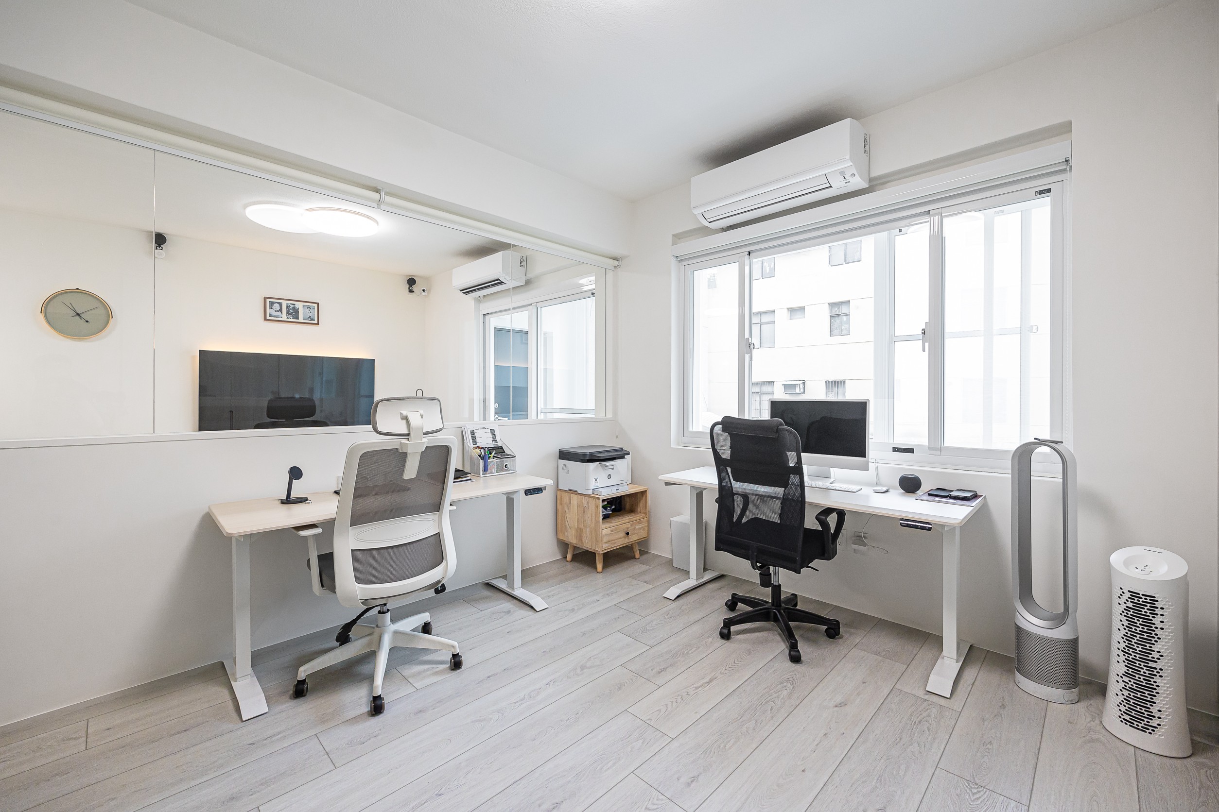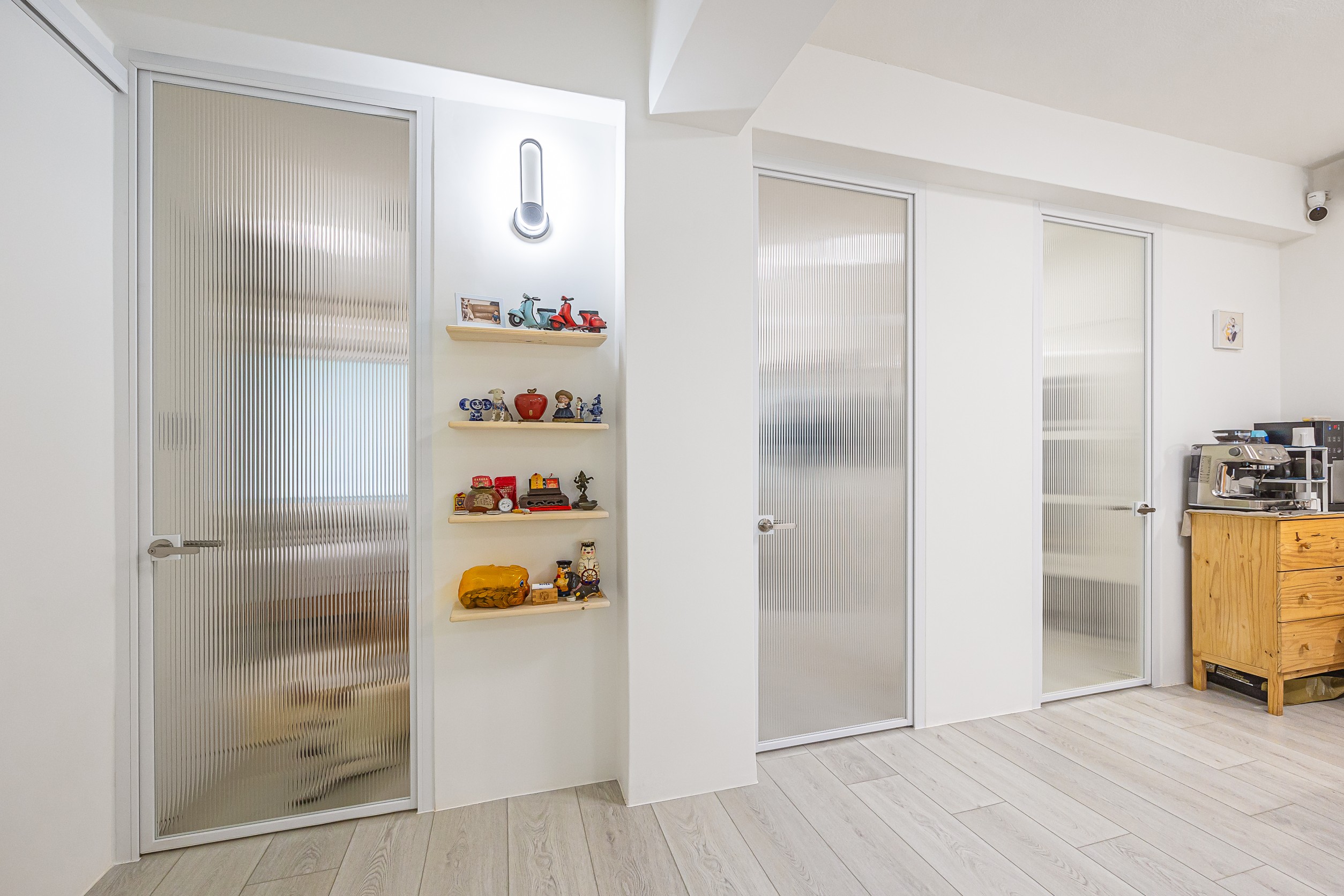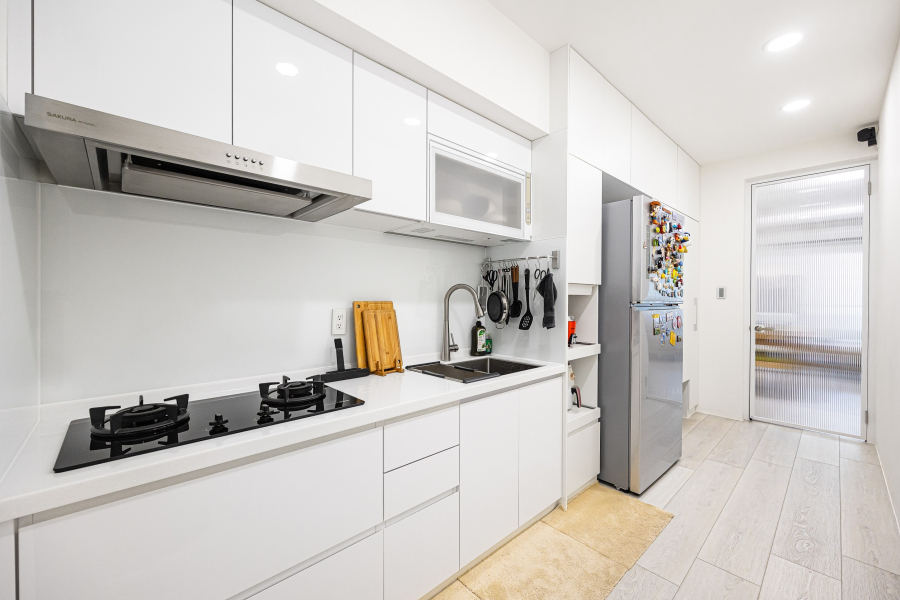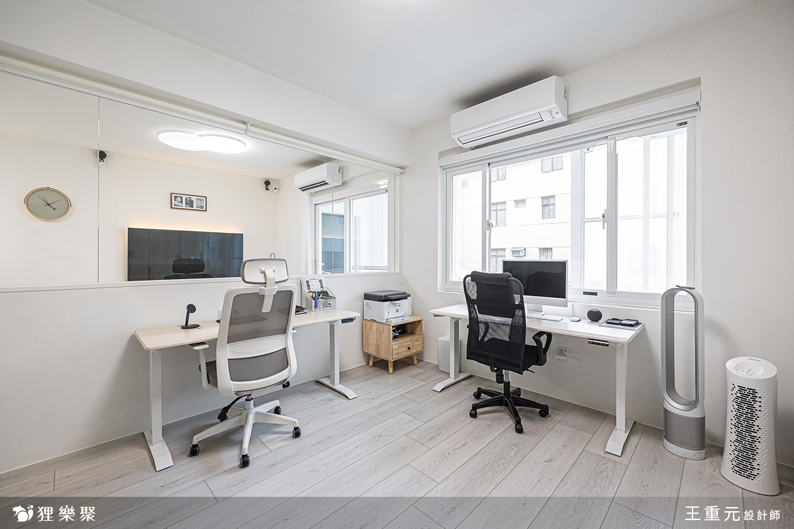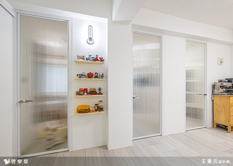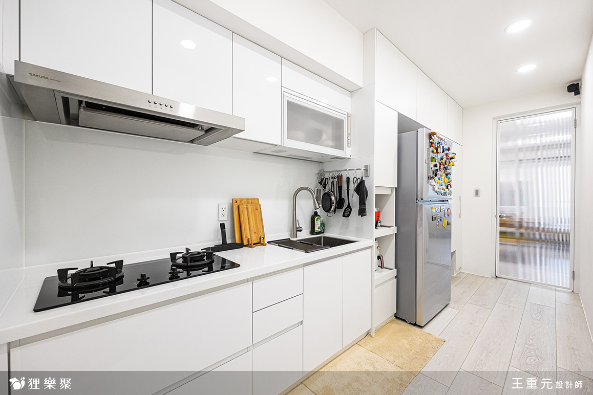 書房以半牆+玻璃規劃,不僅減輕實牆帶來的壓迫性、放大空間感,也增添家人間的互動性。廚房部分同樣以純白色系為主搭配溫潤的木地板,不僅耐看、好清潔,日後也能隨屋主喜好隨時更新,使空間更加彈性。
