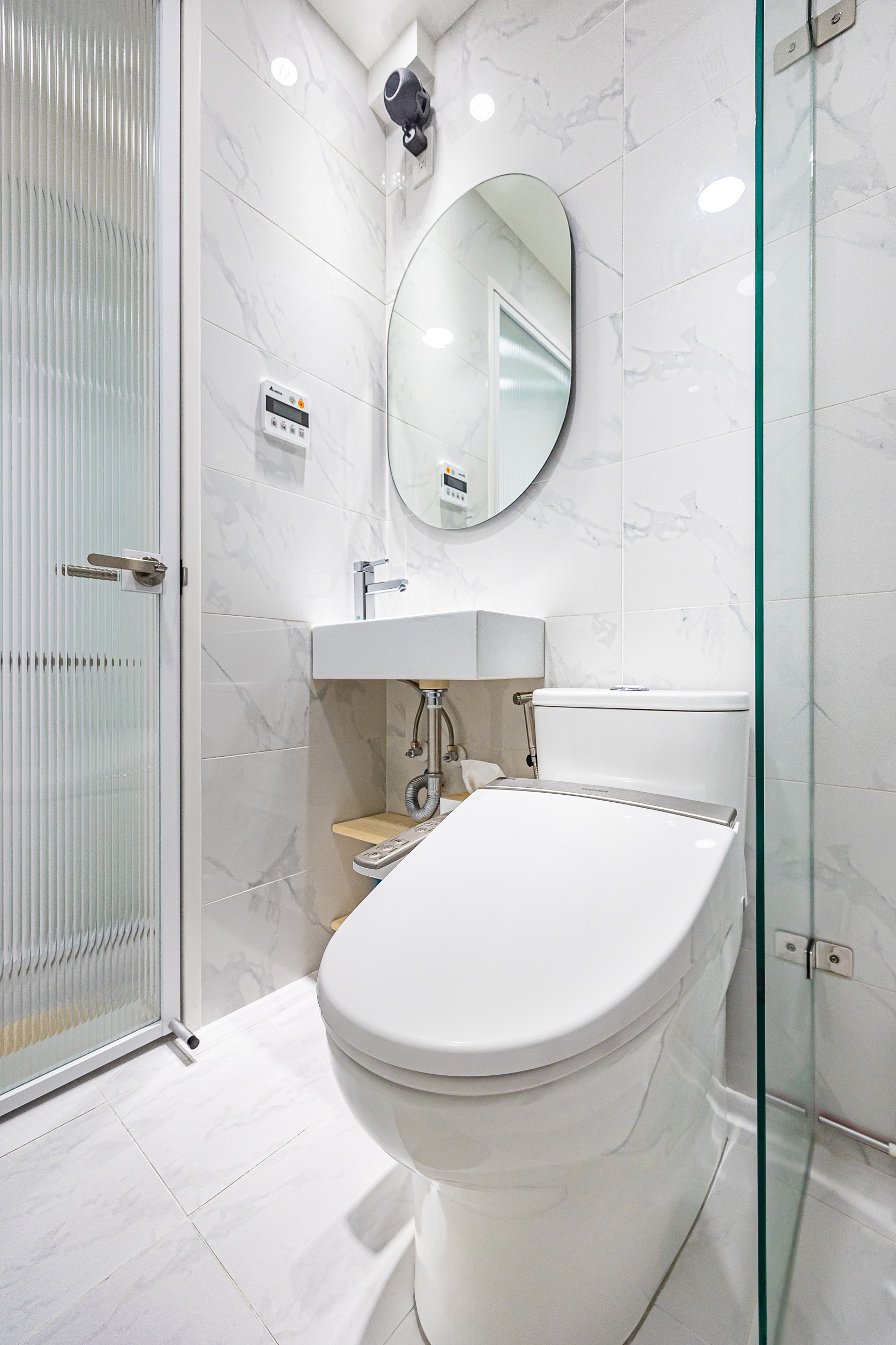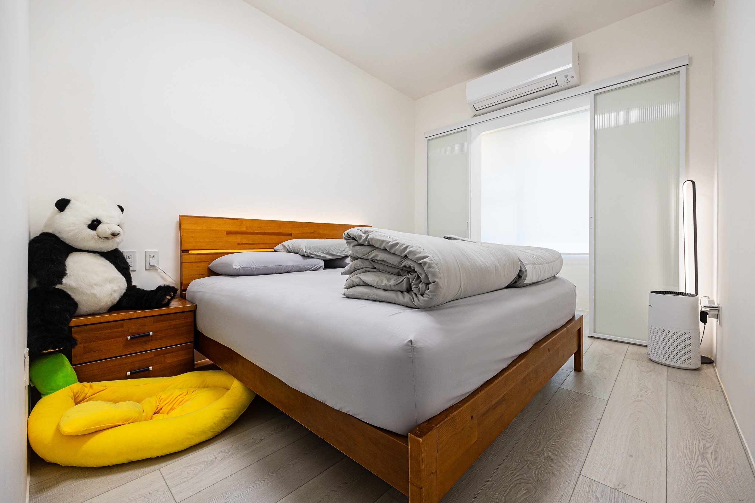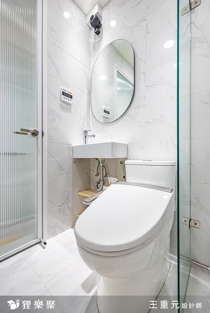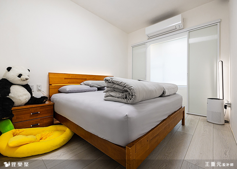 臥室回歸簡單,以純白的牆面襯上木質家具,構築出安穩靜謐的氛圍,同時完整臥室內所需機能。衛浴則利用雪白銀狐磁磚提亮整體色調,賦予空間低調的層次感。