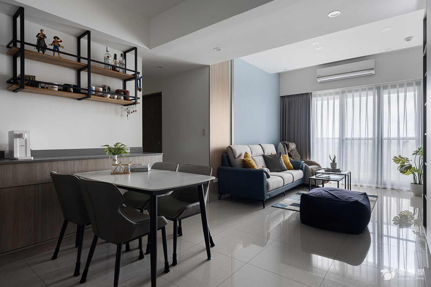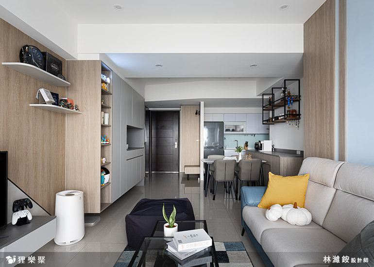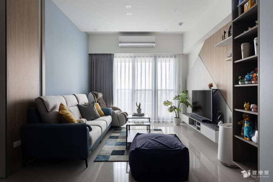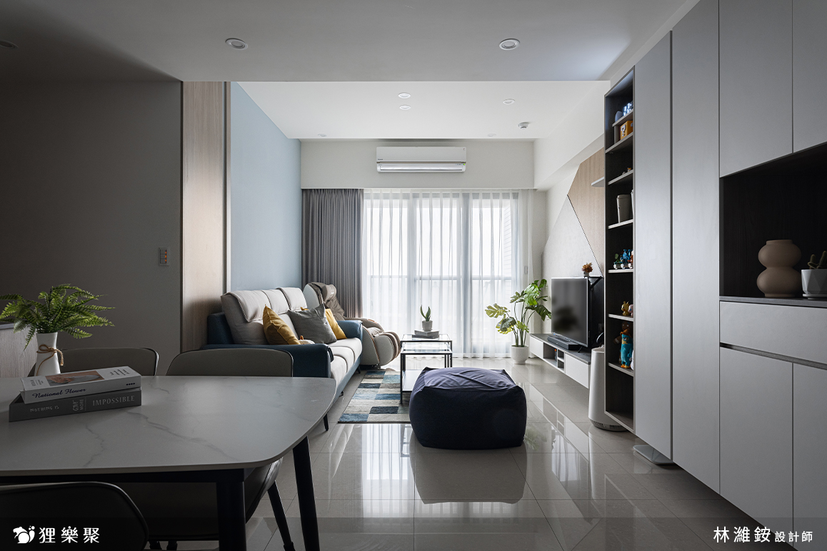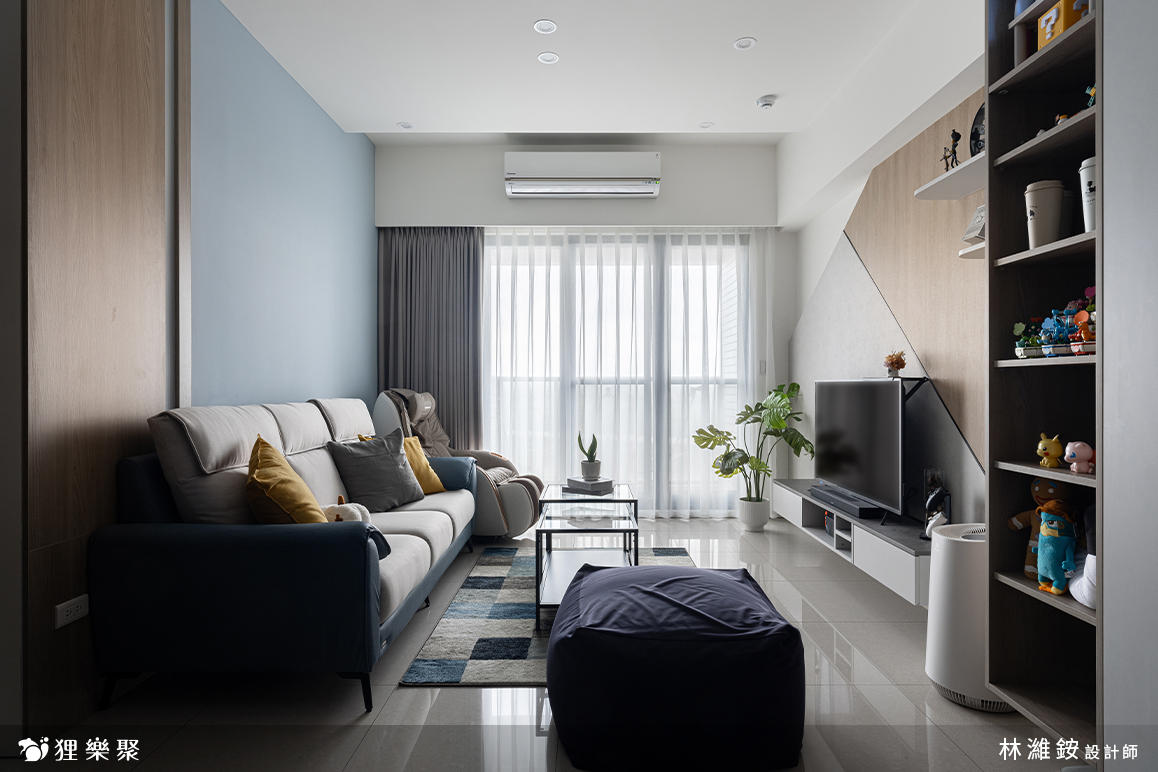 電視牆選用木紋、帶有質感的灰色塗料做幾何分割,襯上一字型的電視櫃與莫蘭迪藍色的沙發背牆,開放式的櫃體設計不僅滿足收納需求,也能讓屋主全方位展示收藏品,為整體增添層次,帶出寬敞且大器的空間感受。
