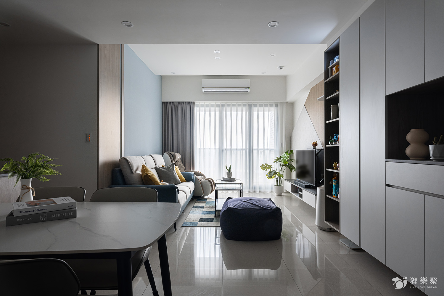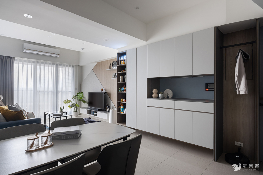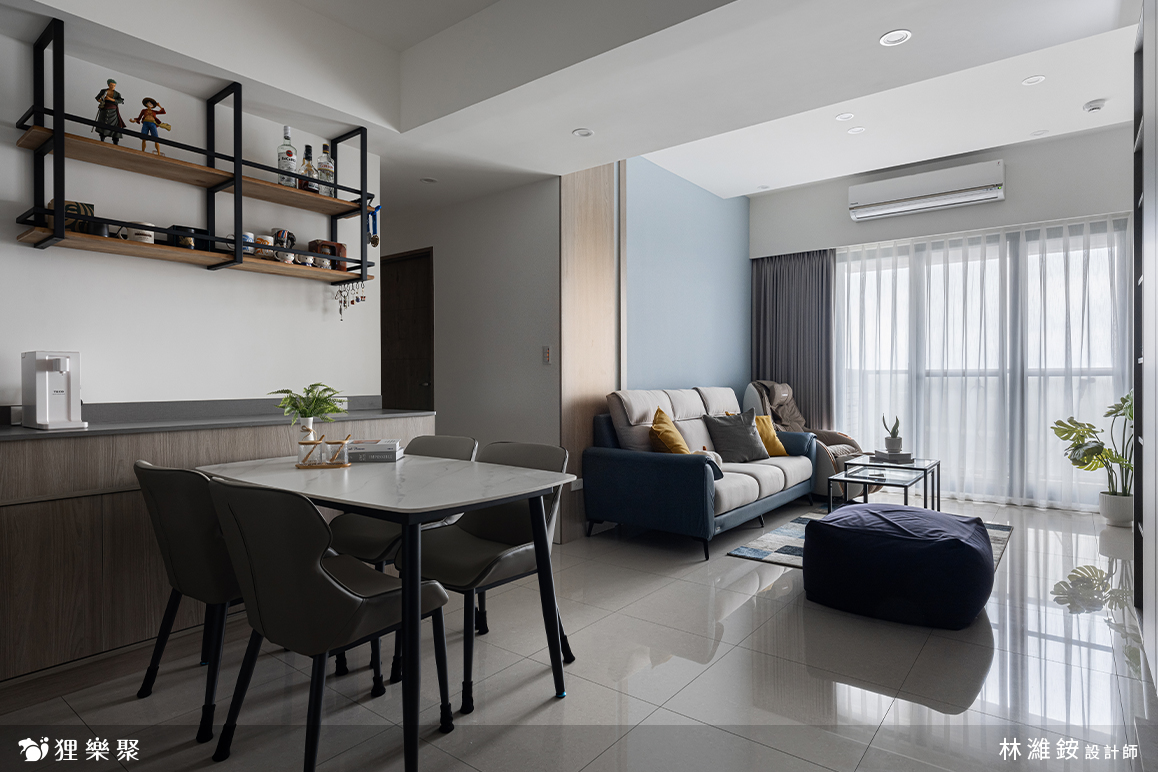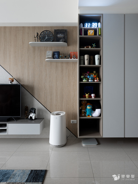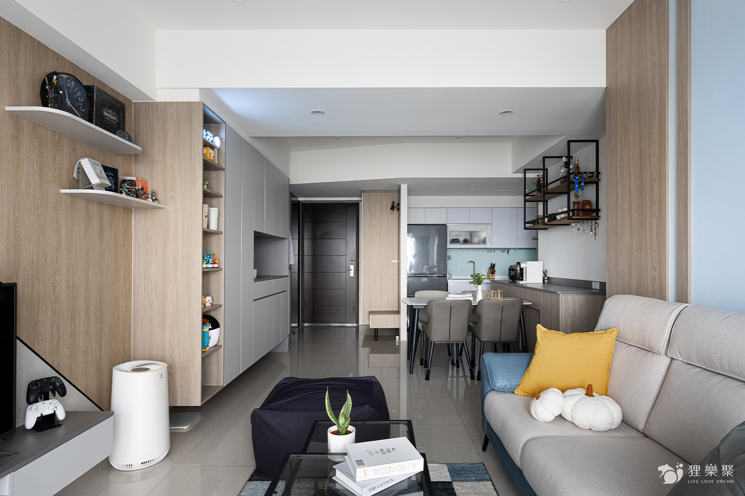 電視牆選用木紋、帶有質感的灰色塗料做幾何分割,襯上一字型的電視櫃與莫蘭迪藍色的沙發背牆,開放式的櫃體設計不僅滿足收納需求,也能讓屋主全方位展示收藏品,為整體增添層次,帶出寬敞且大器的空間感受。
