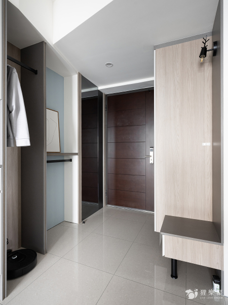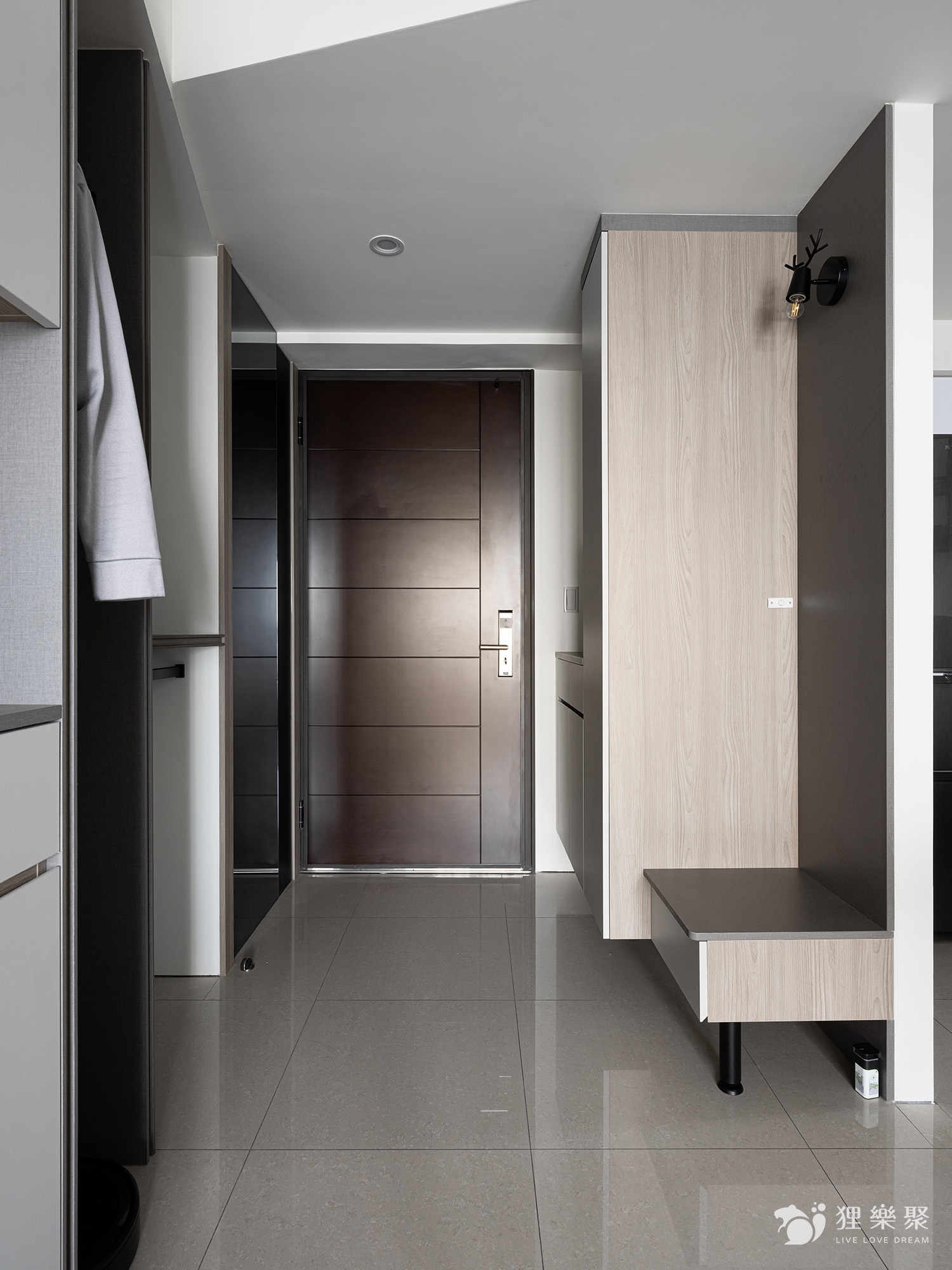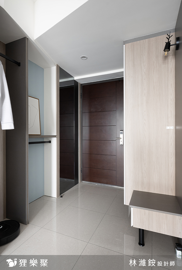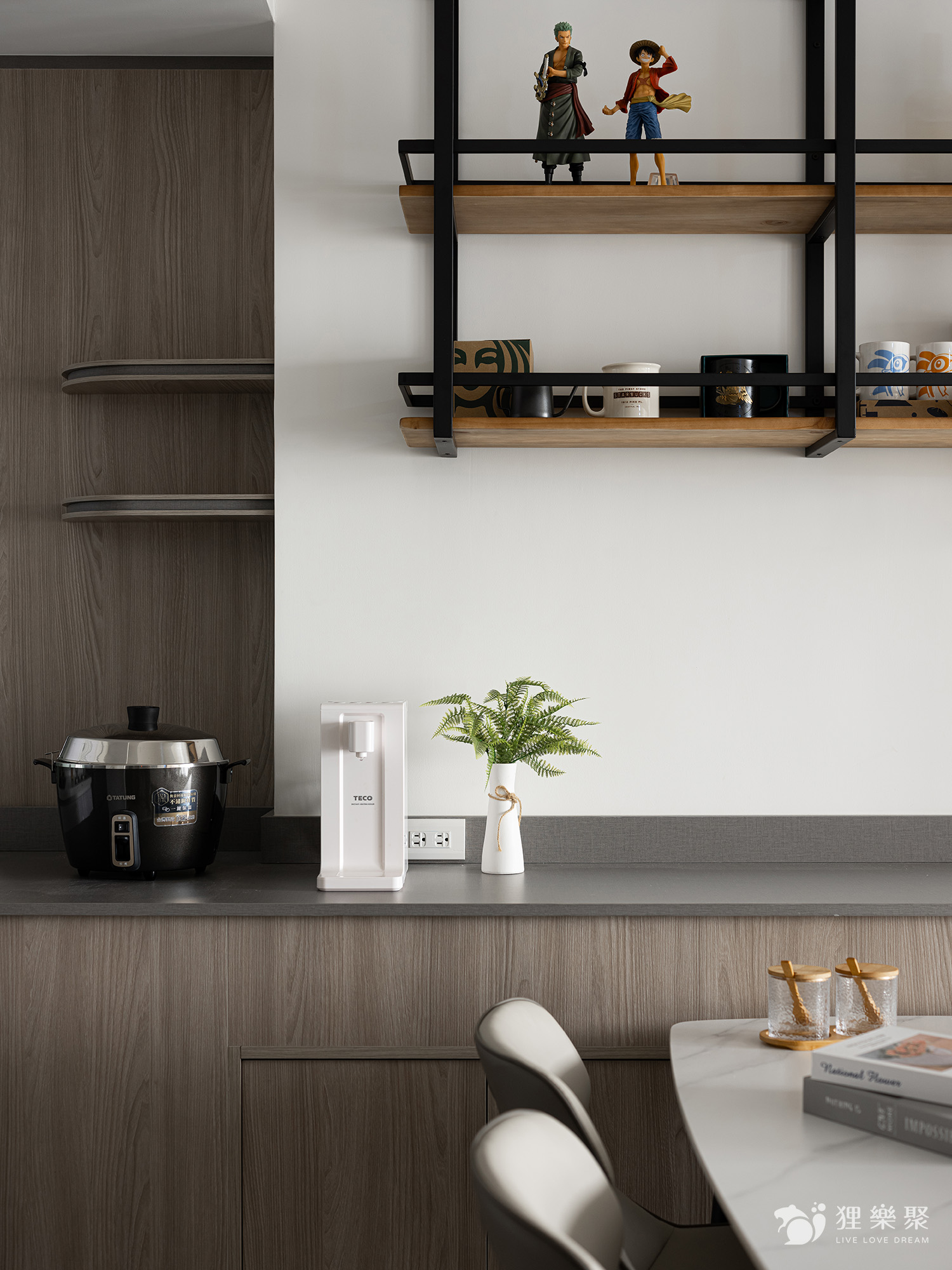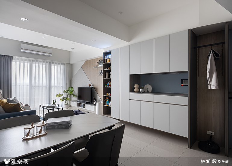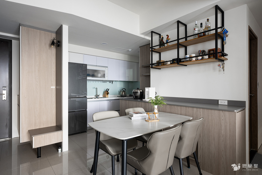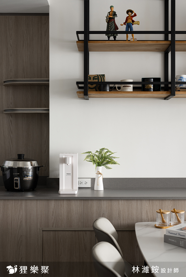 玄關處以大面灰鏡增添空間感,並安排了雨傘架、污衣櫃,同時將進出門所需的置物平台、鞋櫃、穿鞋椅集中於一側,使進出動線更加順暢。餐廳區域以木紋+灰色檯面餐邊櫃搭配鐵件吊櫃,能放置常用的家電小物,也可以收整各式餐具、碗盤,方便用餐時隨手拿取,吊櫃上則能讓屋主自由佈置展示品,創造美觀又好用的餐廳空間。