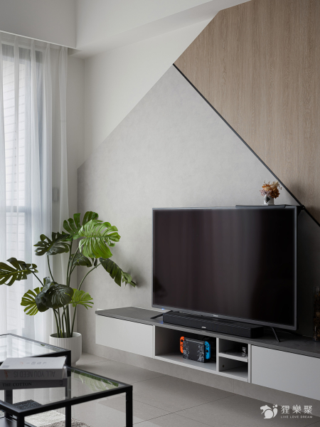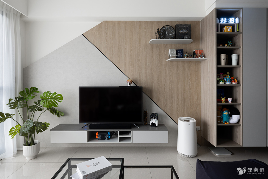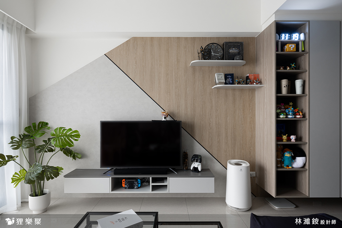 ▲ 幾何圖形分割電視牆與展示櫃搭配