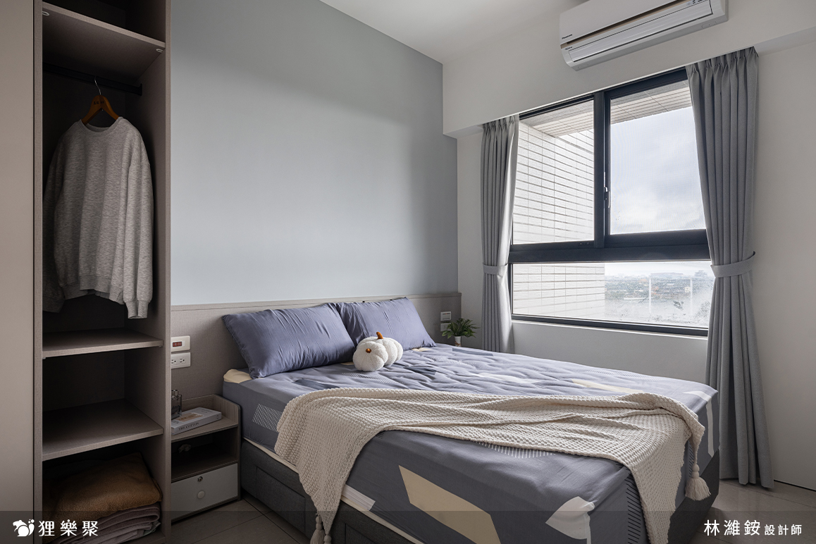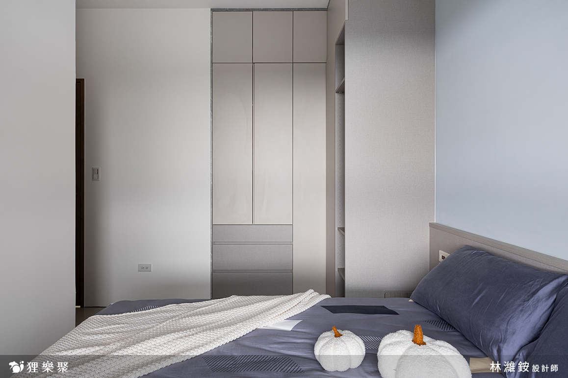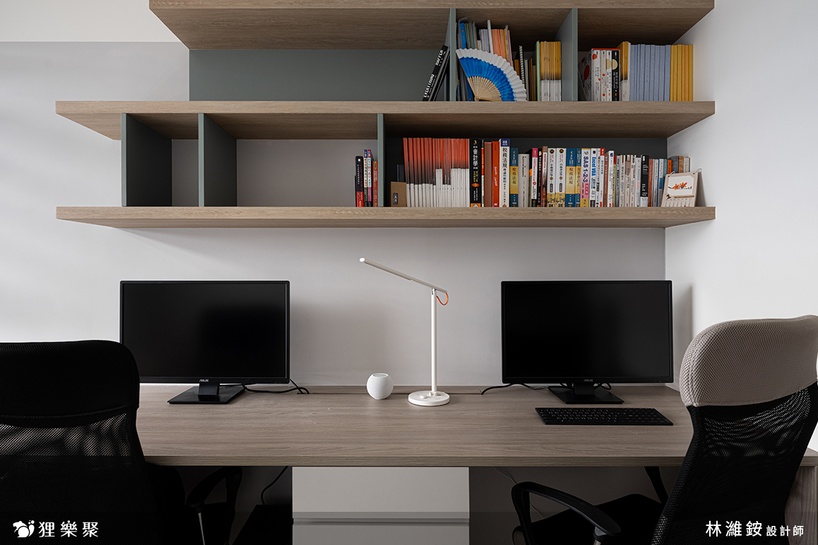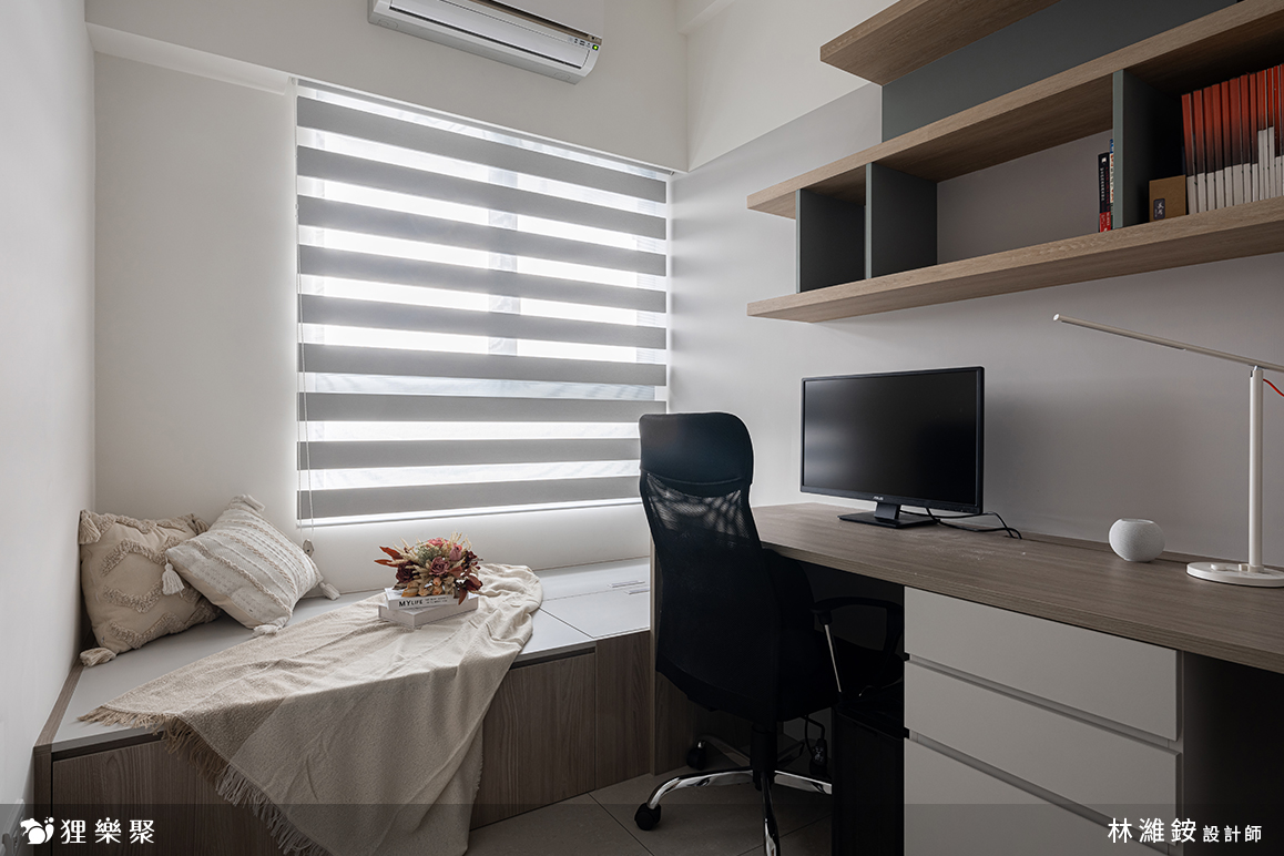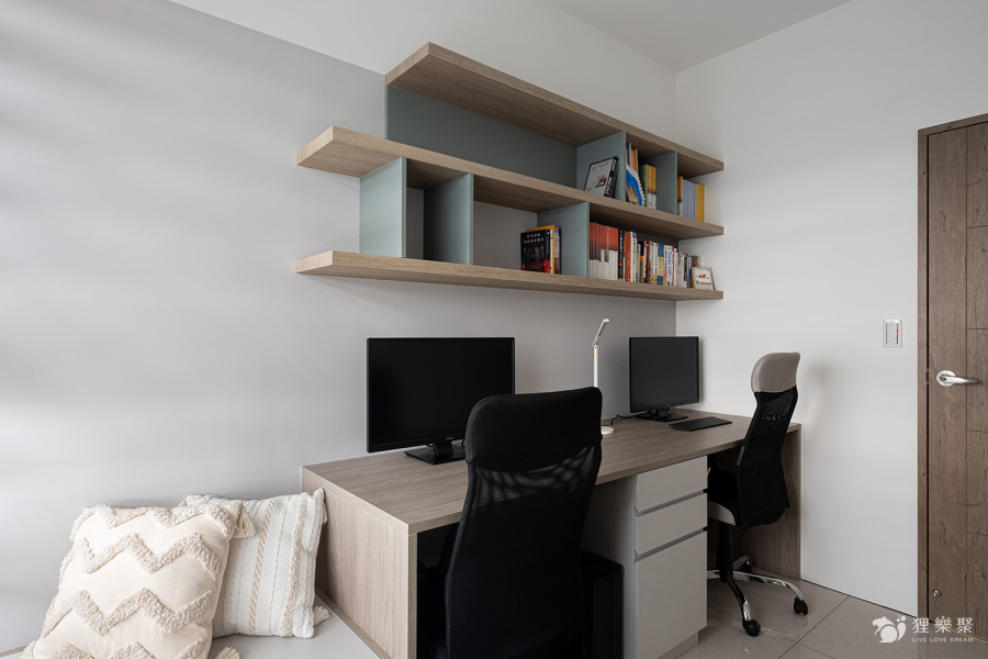 主臥室延續公領域氛圍,以低飽和的莫蘭迪藍刷上床頭牆面,減少視覺壓迫感,賦予空間輕柔且安穩的感受。書房平時則作為屋主的工作區域,設計師特別規劃了電腦及資訊設備的專屬位置,結合吊櫃、架高地台,客人來訪時也能鋪床作為客房使用,提升空間彈性。