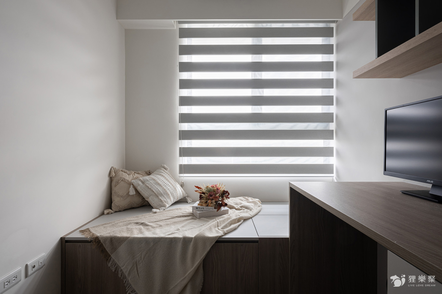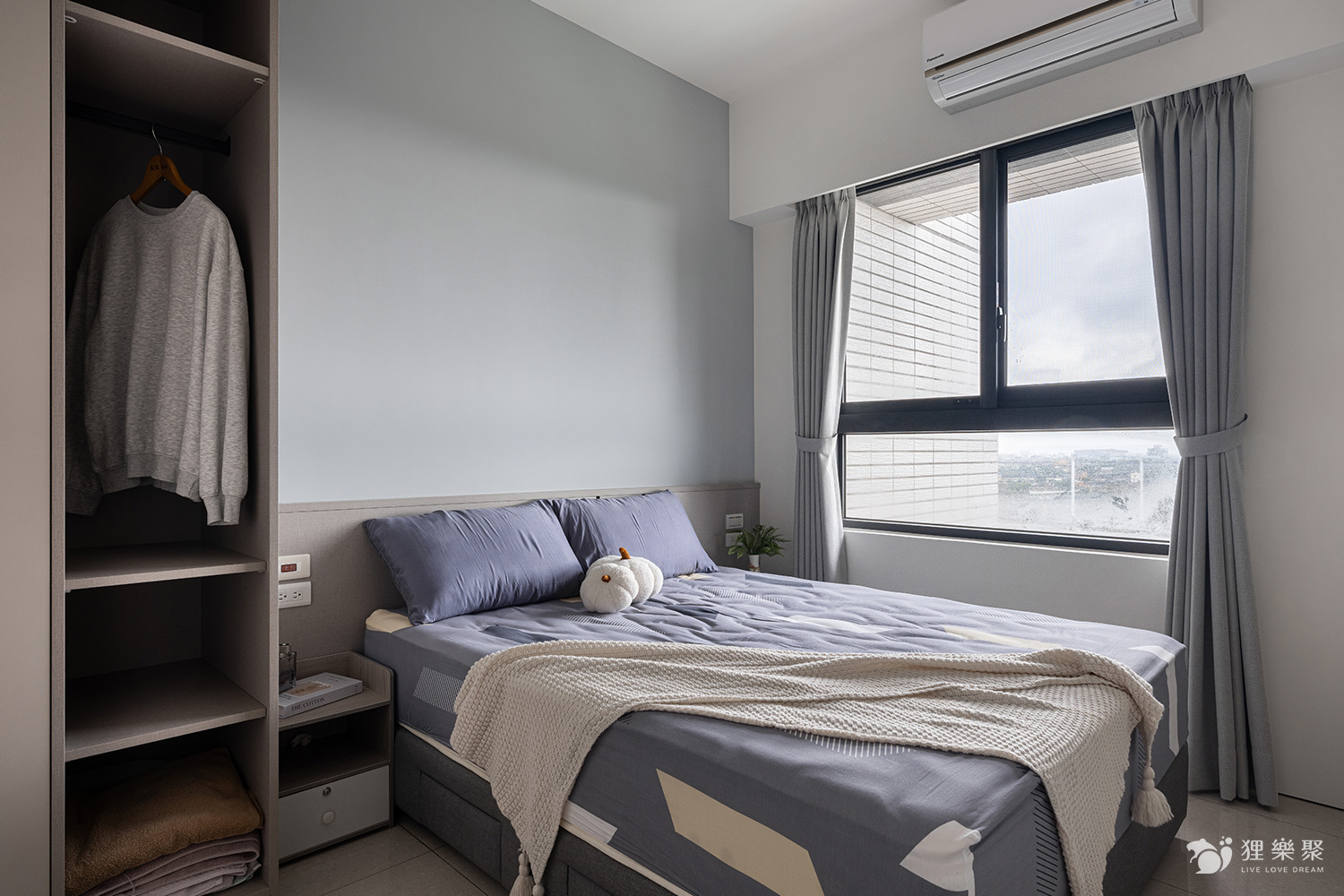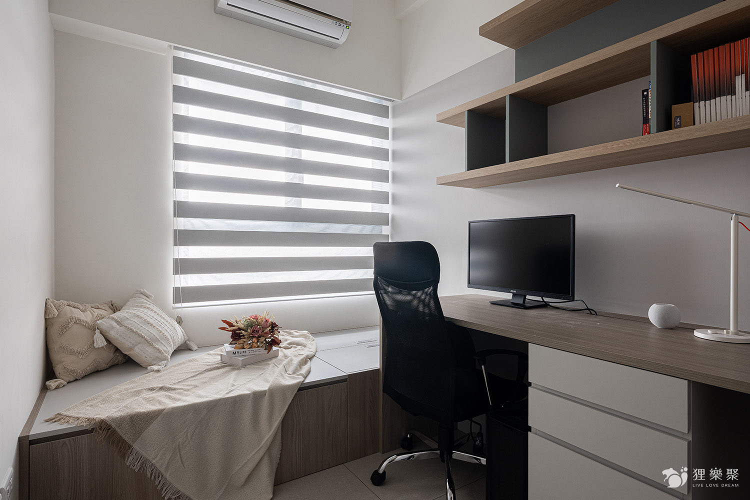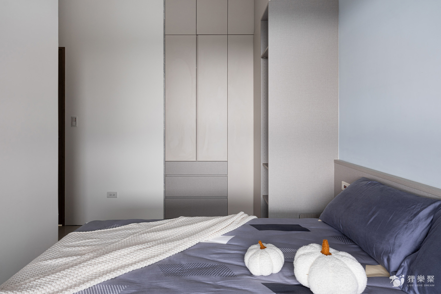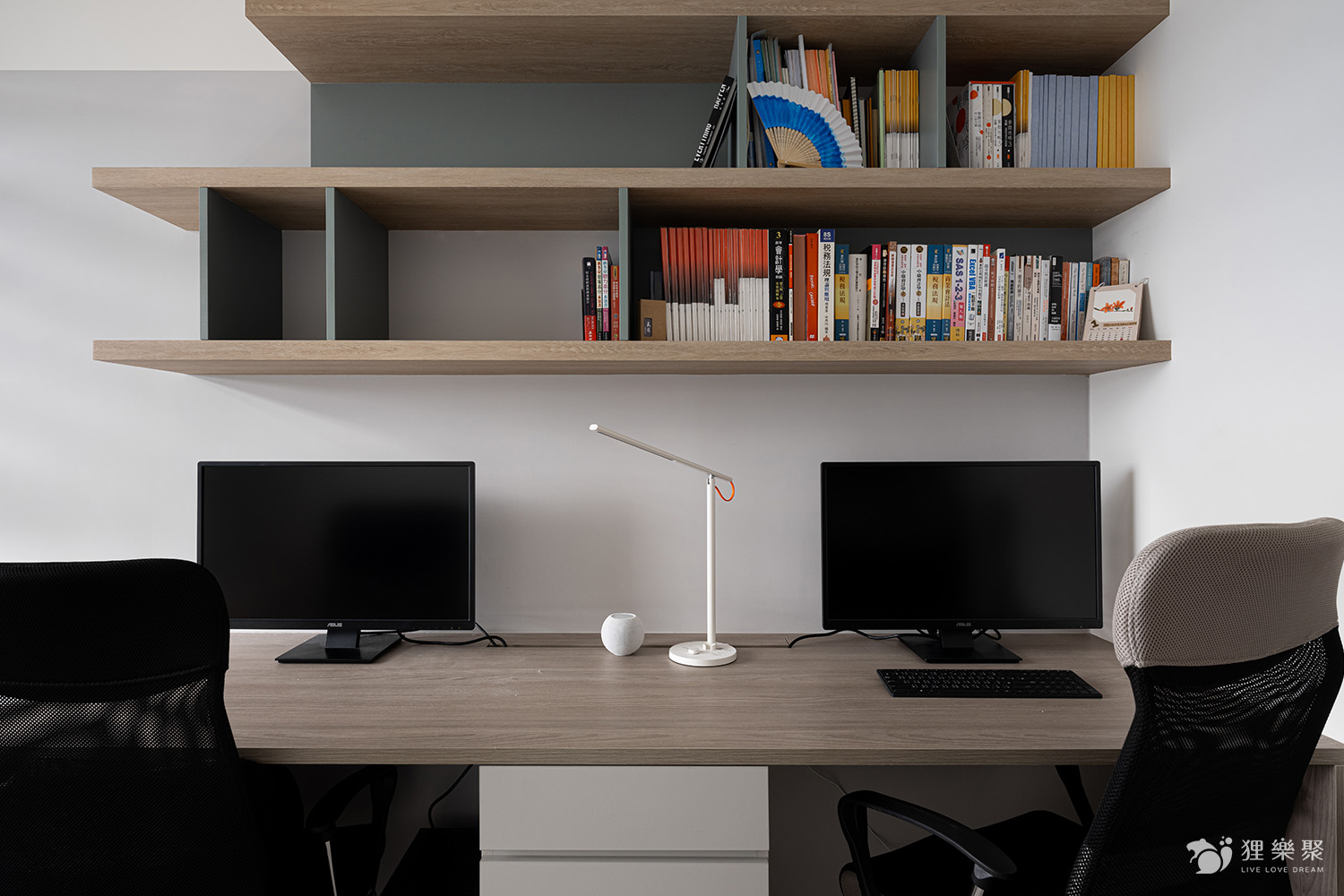 主臥室延續公領域氛圍,以低飽和的莫蘭迪藍刷上床頭牆面,減少視覺壓迫感,賦予空間輕柔且安穩的感受。書房平時則作為屋主的工作區域,設計師特別規劃了電腦及資訊設備的專屬位置,結合吊櫃、架高地台,客人來訪時也能鋪床作為客房使用,提升空間彈性。