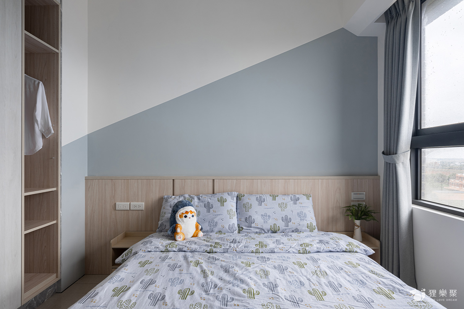 ▲ 幾何圖形分割的床頭設計使空間更有趣