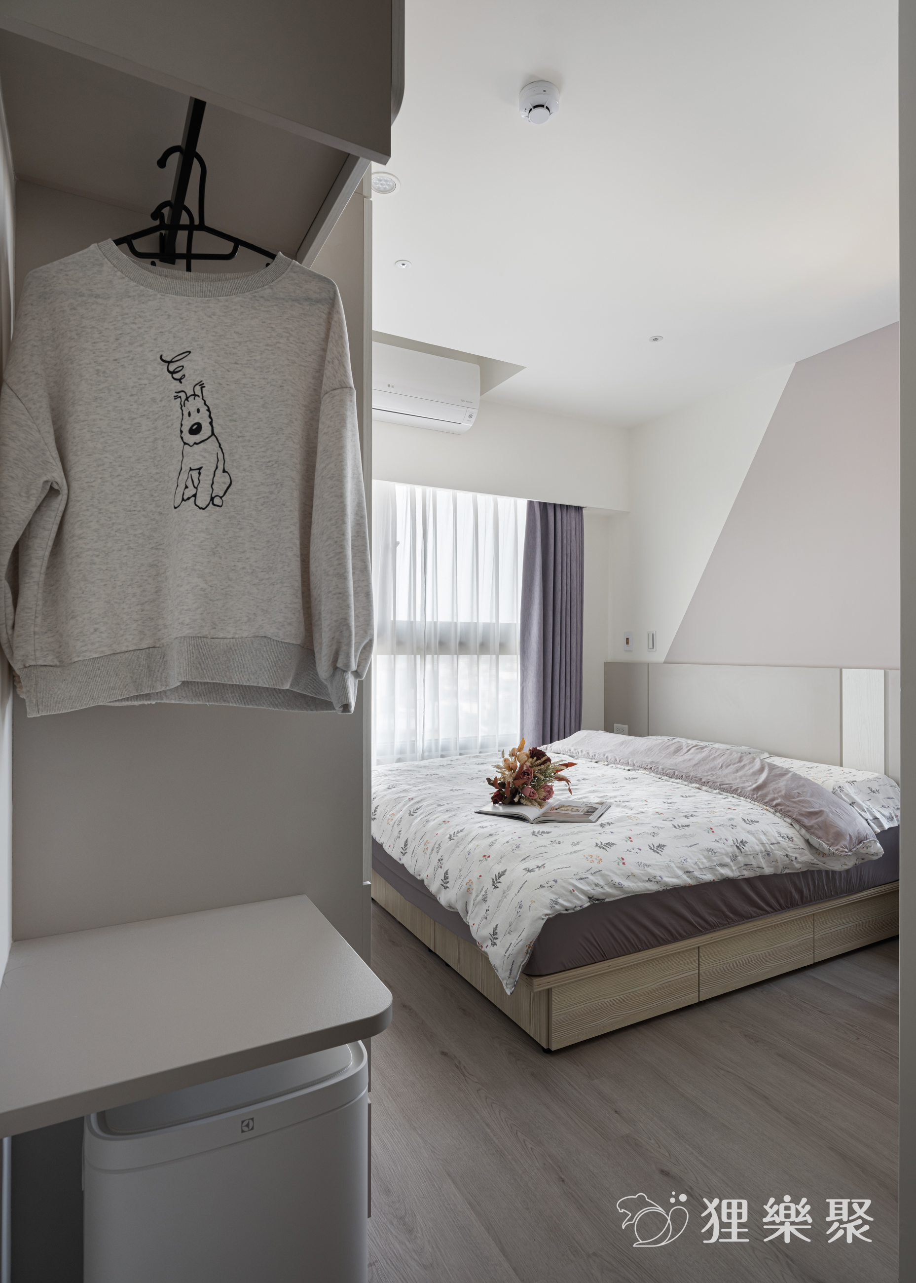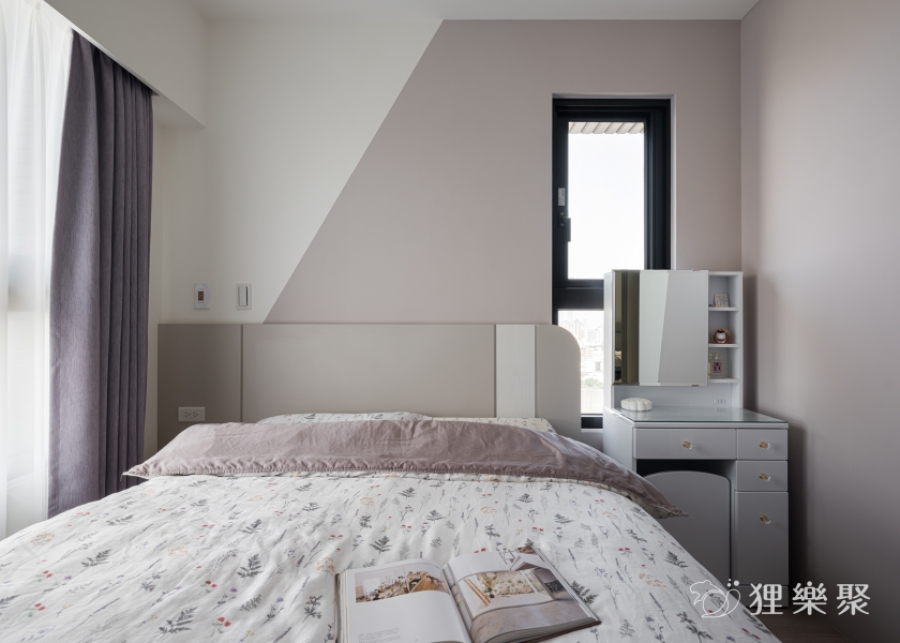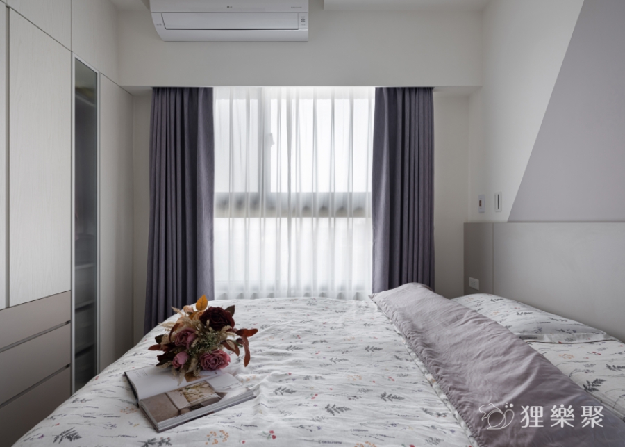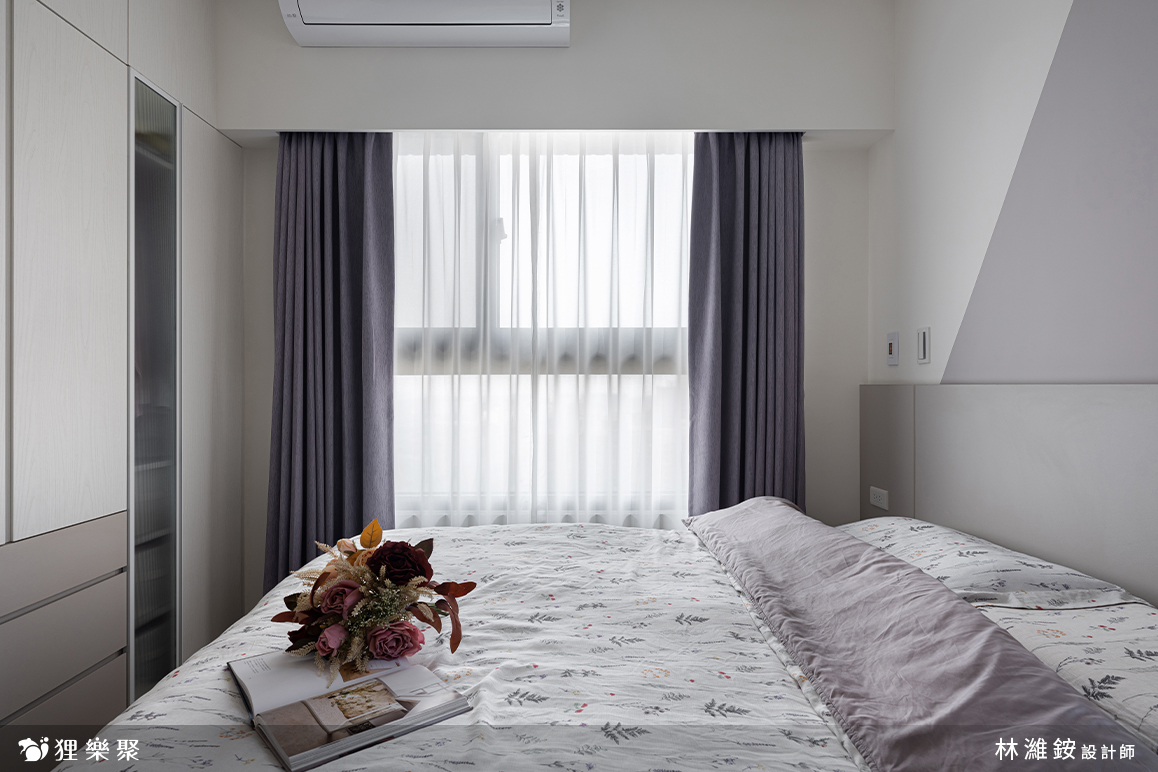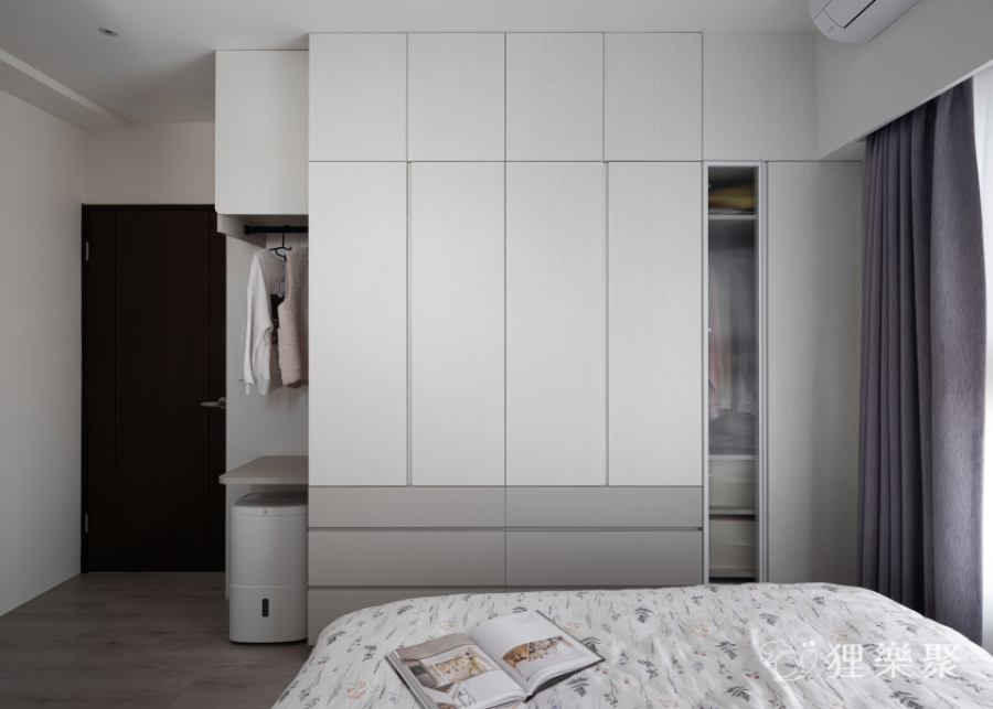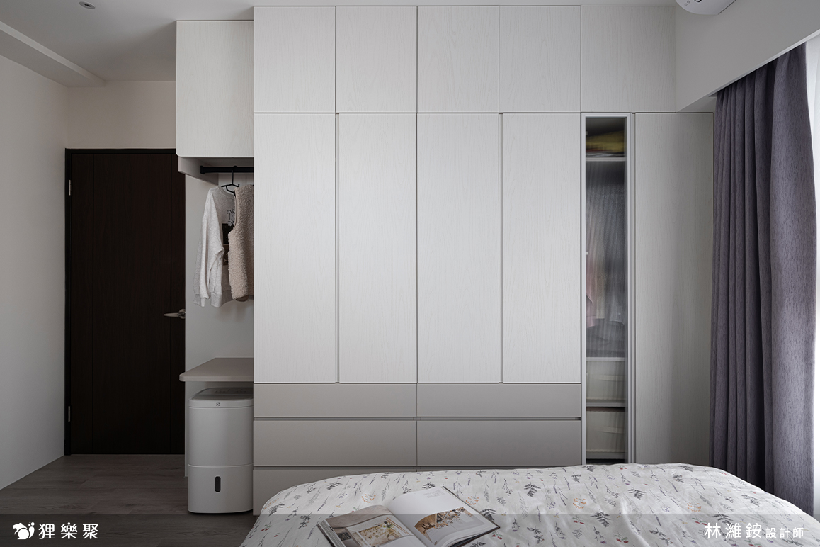 主臥室延續公共區域的設計精神,利用莫蘭迪色與大量留白做跳色搭配,維持溫潤清爽的氛圍。衣櫃中巧妙安插了局部做開放設計,除了滿足不同需求的收納,也大幅減低衣櫃在空間中的壓迫感。