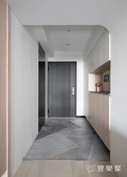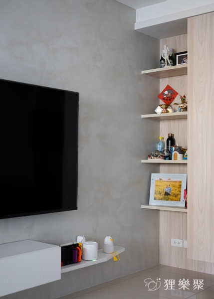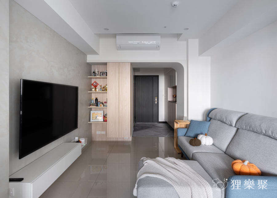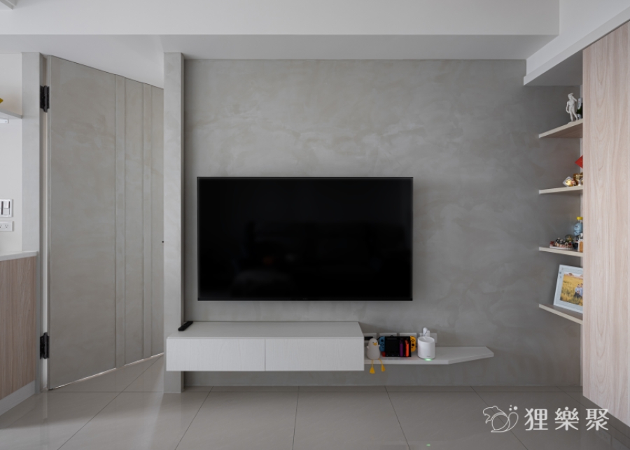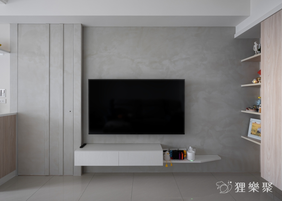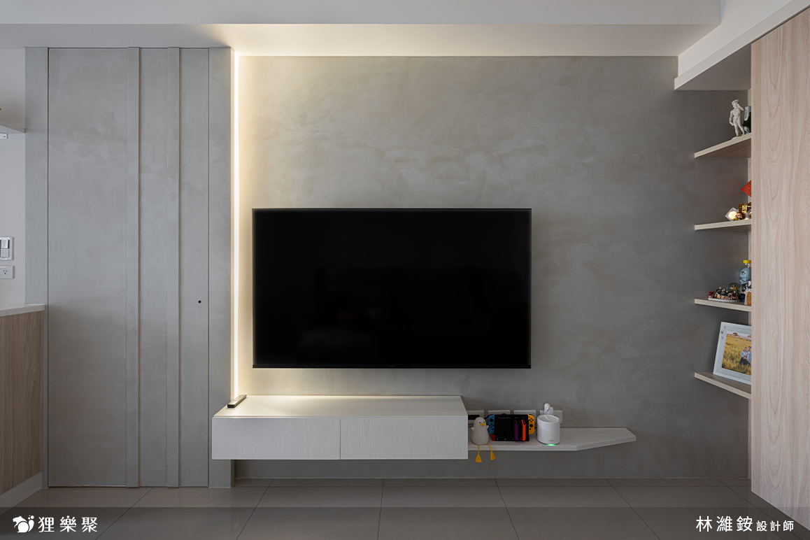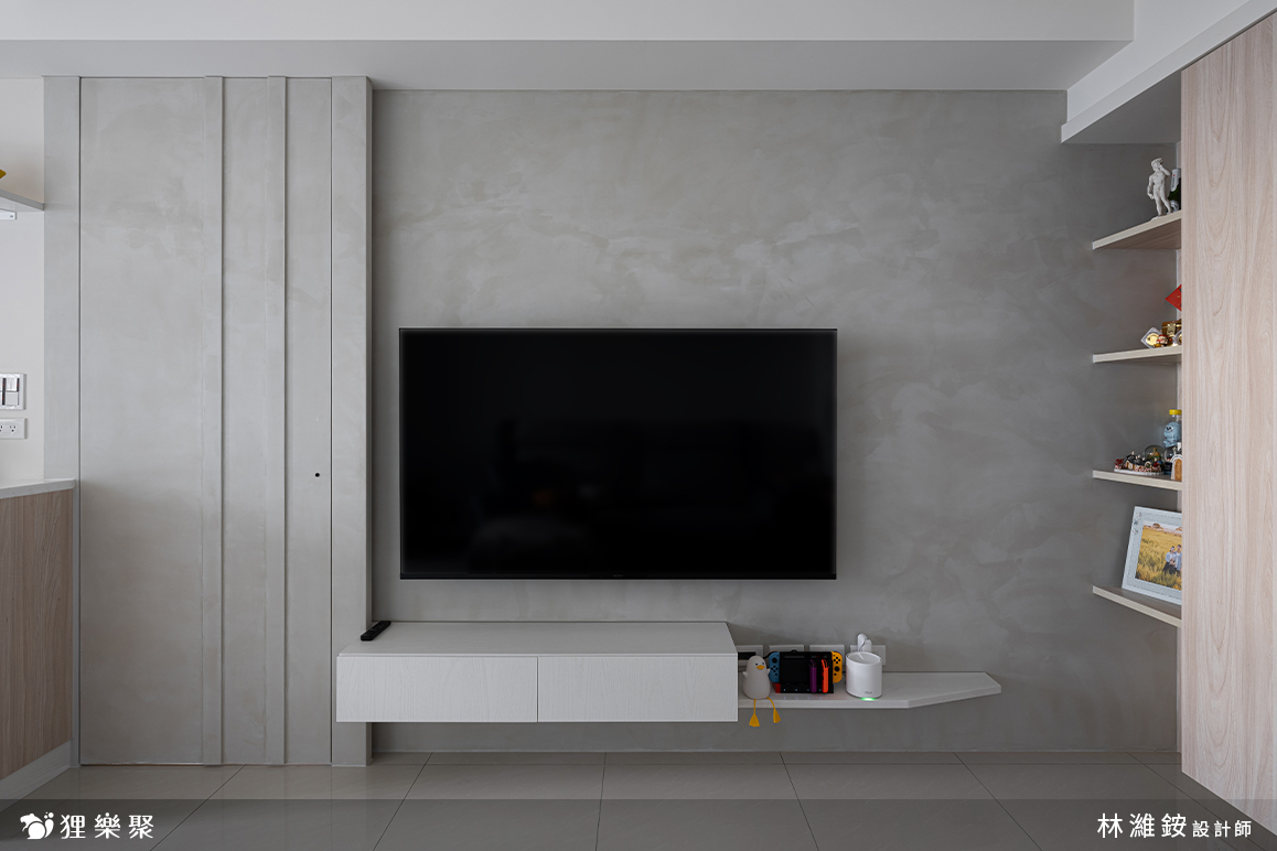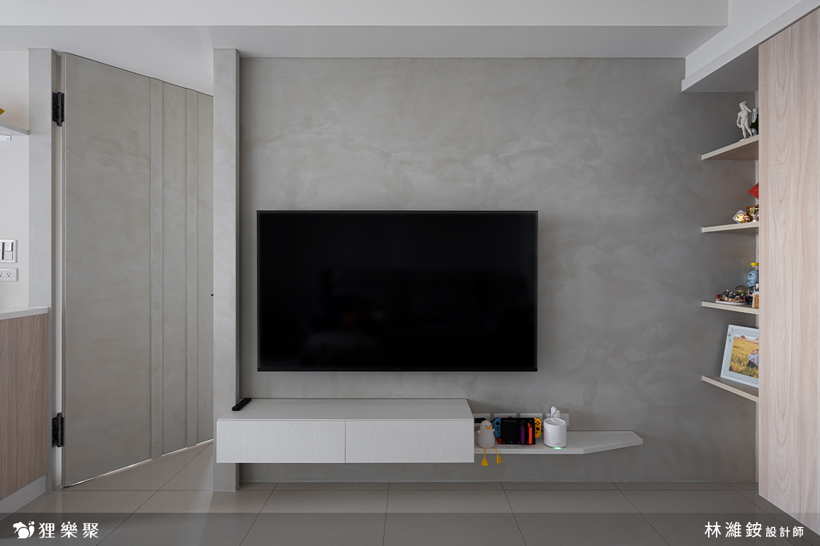 屋主非常喜歡隱藏門的設計。隱藏門不但能完整區隔出室內的公共空間與休息領域,也同時延伸加長電視牆面的寬度,讓客廳的空間感更加開闊。 淺灰清水模的塗料搭配淺色及白色的木紋,除了維持空間中溫潤的木頭質感,還額外增添了明亮清爽的元素,讓整體更加輕盈俐落。延伸閱讀:<< 學會5招,輕鬆構築現代風裝潢俐落風範 >>