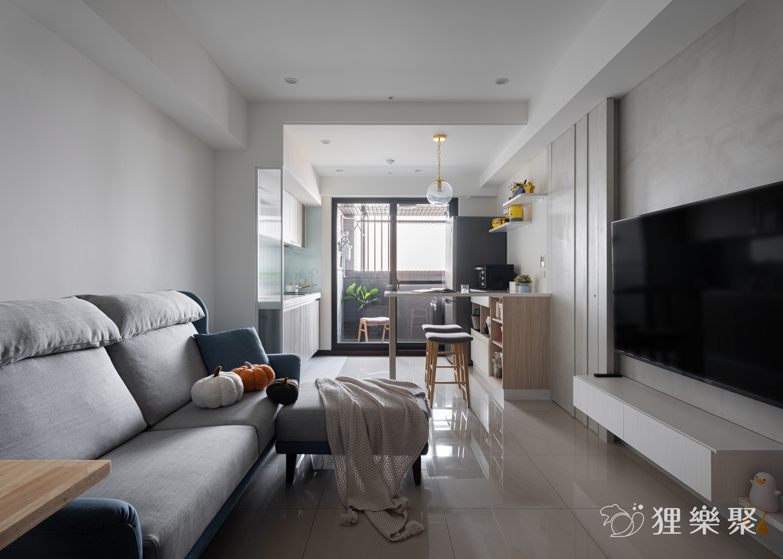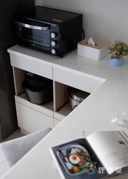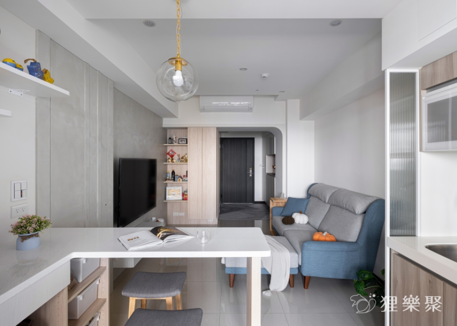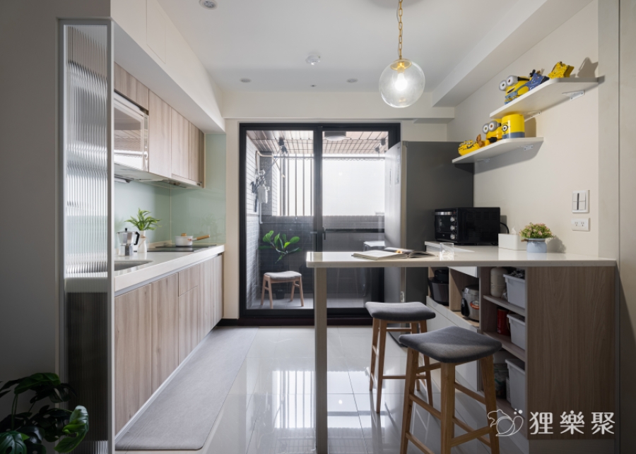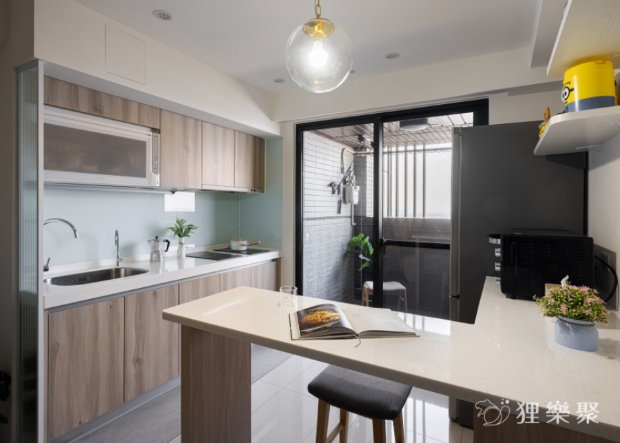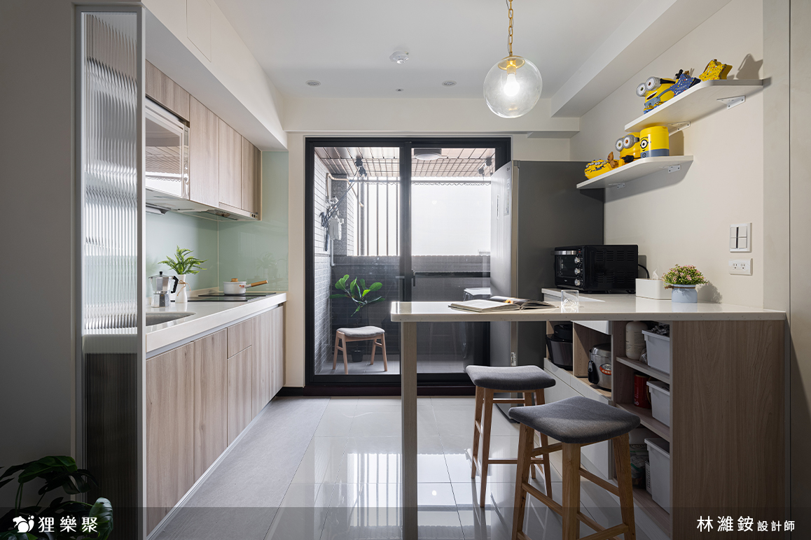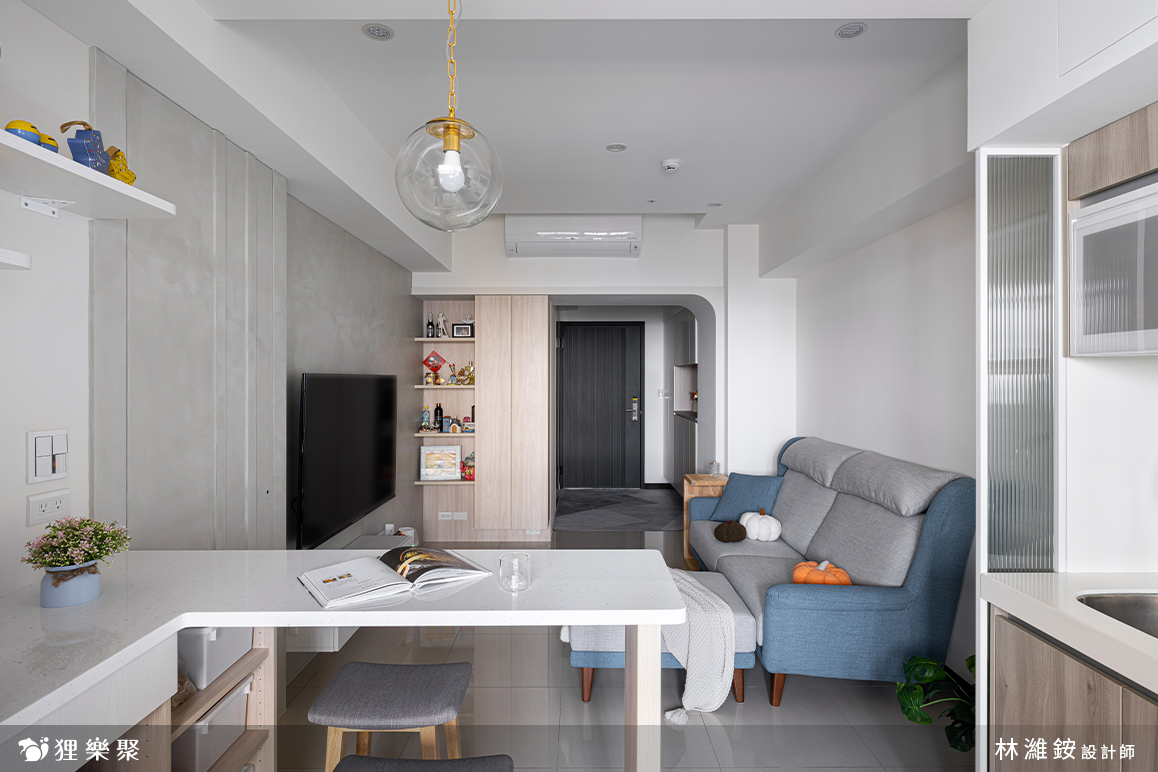 為了削減室內家具及櫃子的量體,設計師與屋主討論後,利用輕盈小巧的吧檯結合電器櫃的設計,取代了笨重的餐桌和電器高櫃。這麼做不但留有足夠的收納空間與生活動線,還能分享餐廳區域的採光到整個公共空間,提升室內明亮度。