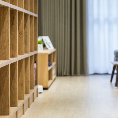 源自日文的「無垢材」即是實木的意思,當我們去無印良品的時候能夠注意到展示櫃皆是溫潤的實木做成,是無印風最明顯的特色之一。我們在連接客餐廳的整面方格實木書櫃的造型上選擇了最簡單的設計,每一格都是相同的大小且不做門片,線條簡約的櫃體弱化了層層擺放的書籍帶來的些許雜亂感。
