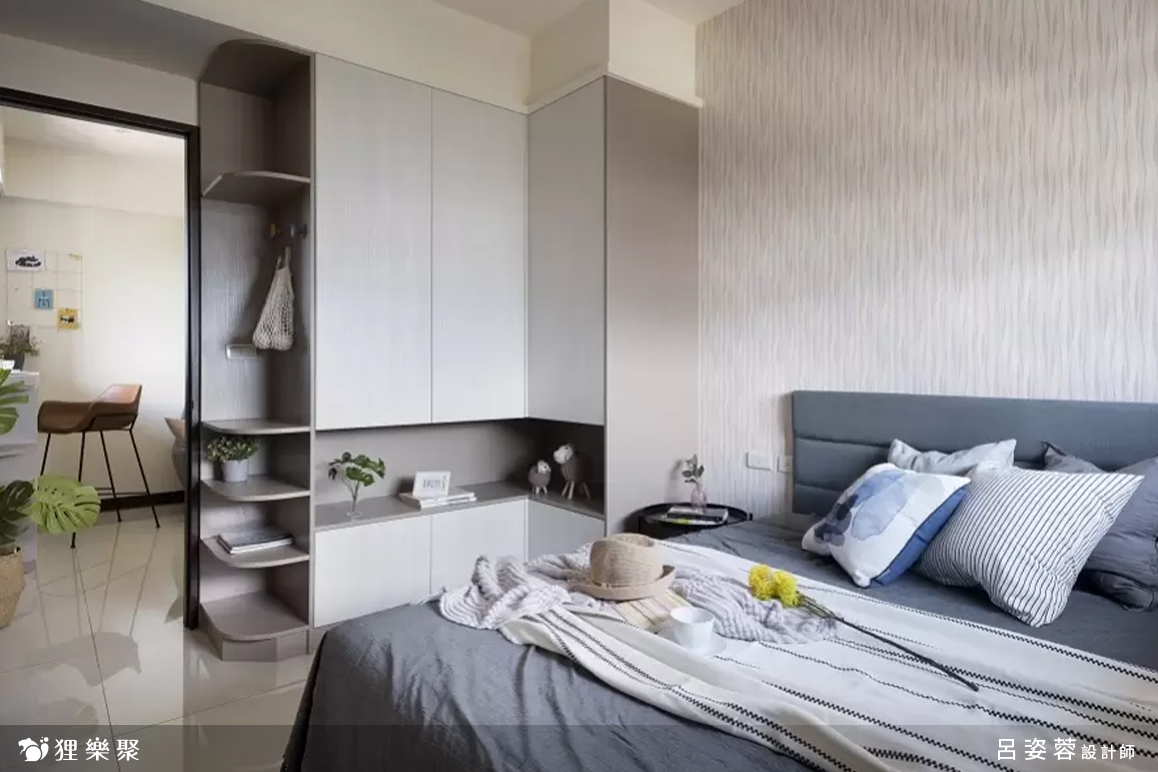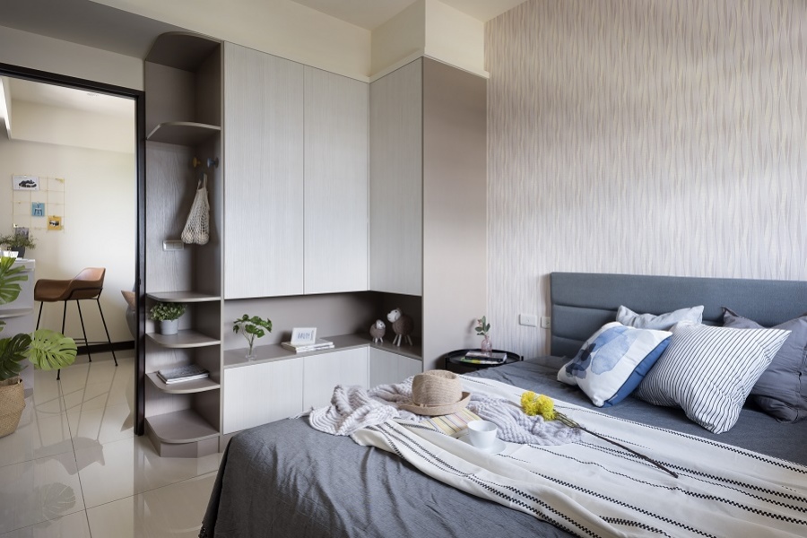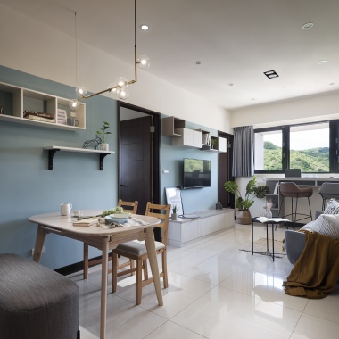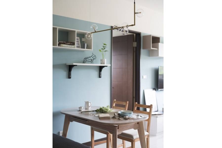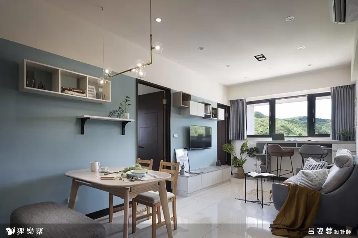 整個家都以中性的藍色和灰色互相搭配為主,讓空間顯得休閒又溫柔、沉靜的色調讓人能夠好好的靜下心來深呼吸,打造出清爽舒適的環境;另外輔以百搭的米杏色做櫃體,淡淡的顏色不容易搶奪視線,而顏色較亮眼的木紋餐桌則從基本色調中跳脫出來,用以區隔不同功能的空間。延伸閱讀:<< 小宅放大術裝潢秘笈,放大你的家! >>