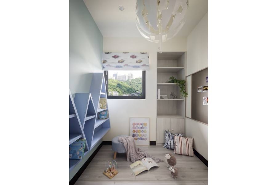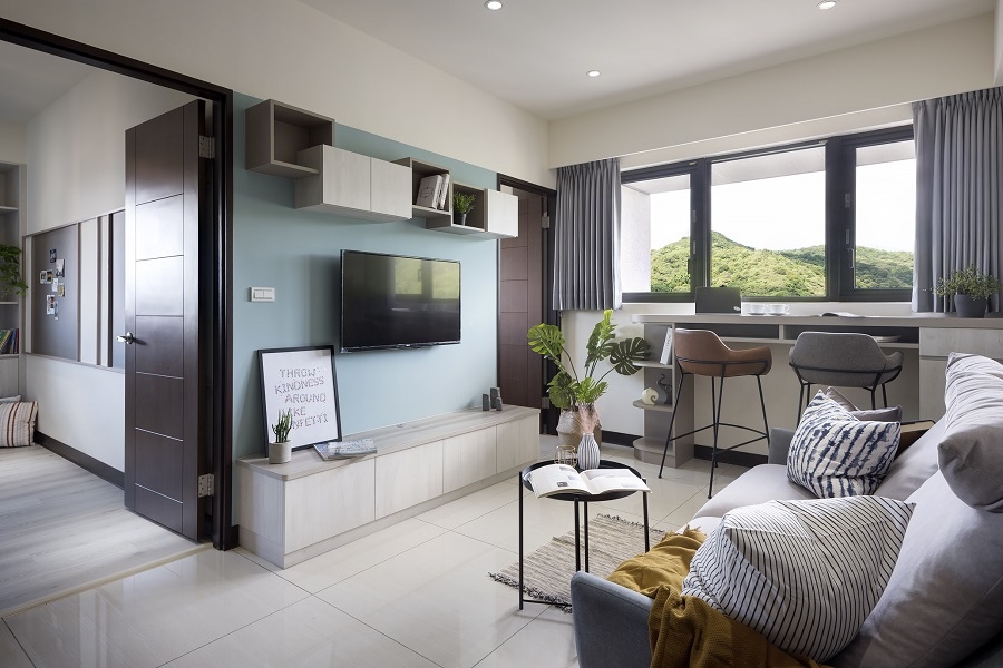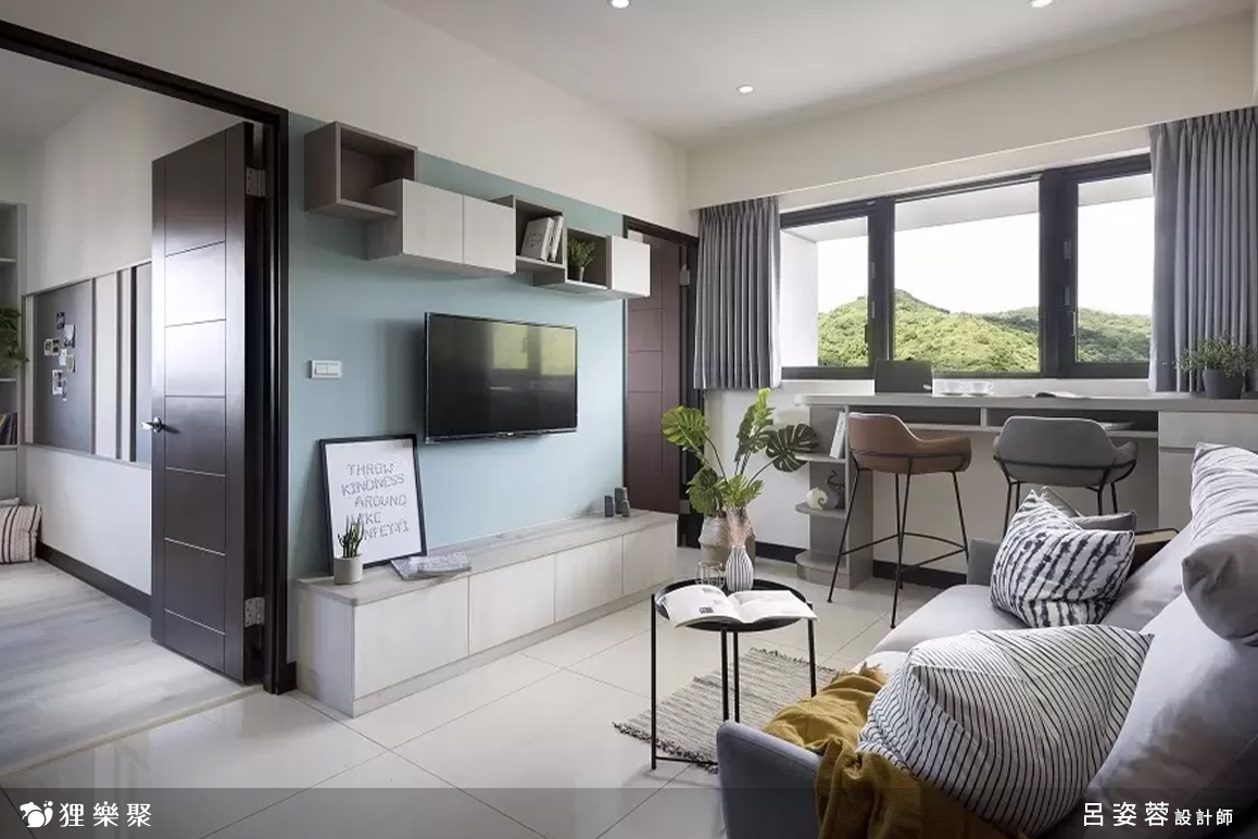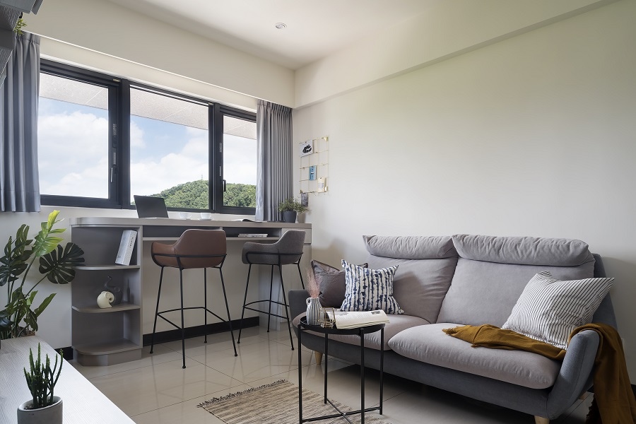 簡約風格最重視留白,留白並不是什麼都沒有,而是無物勝有物的一種意境。極簡的設計不會把空間設計得很滿,只在實用的物件上兼顧美觀性,除此之外就不會再有多餘的設計。在客廳中除了基本的電視、沙發、茶几以及些許展示收納櫃之外,就只有窗邊的書桌,而窗框框住的山景就像一幅畫,巧妙地利用周遭環境,替室內空間增色不少。延伸閱讀:<< 打造極簡風裝潢不踩雷,4關鍵重點必看! >>