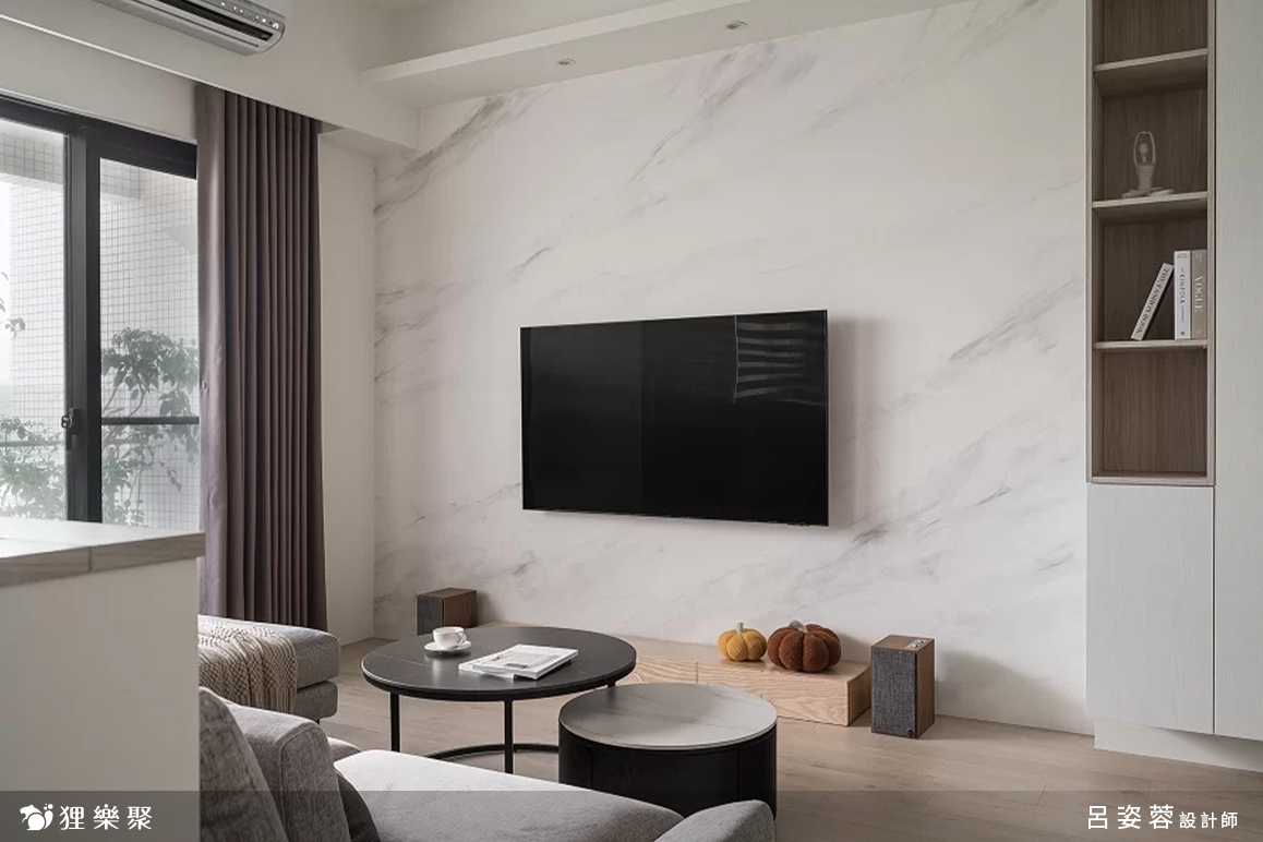 ▲ 電視牆選用白色的仿大理石板材