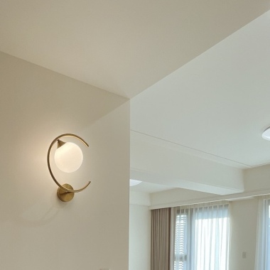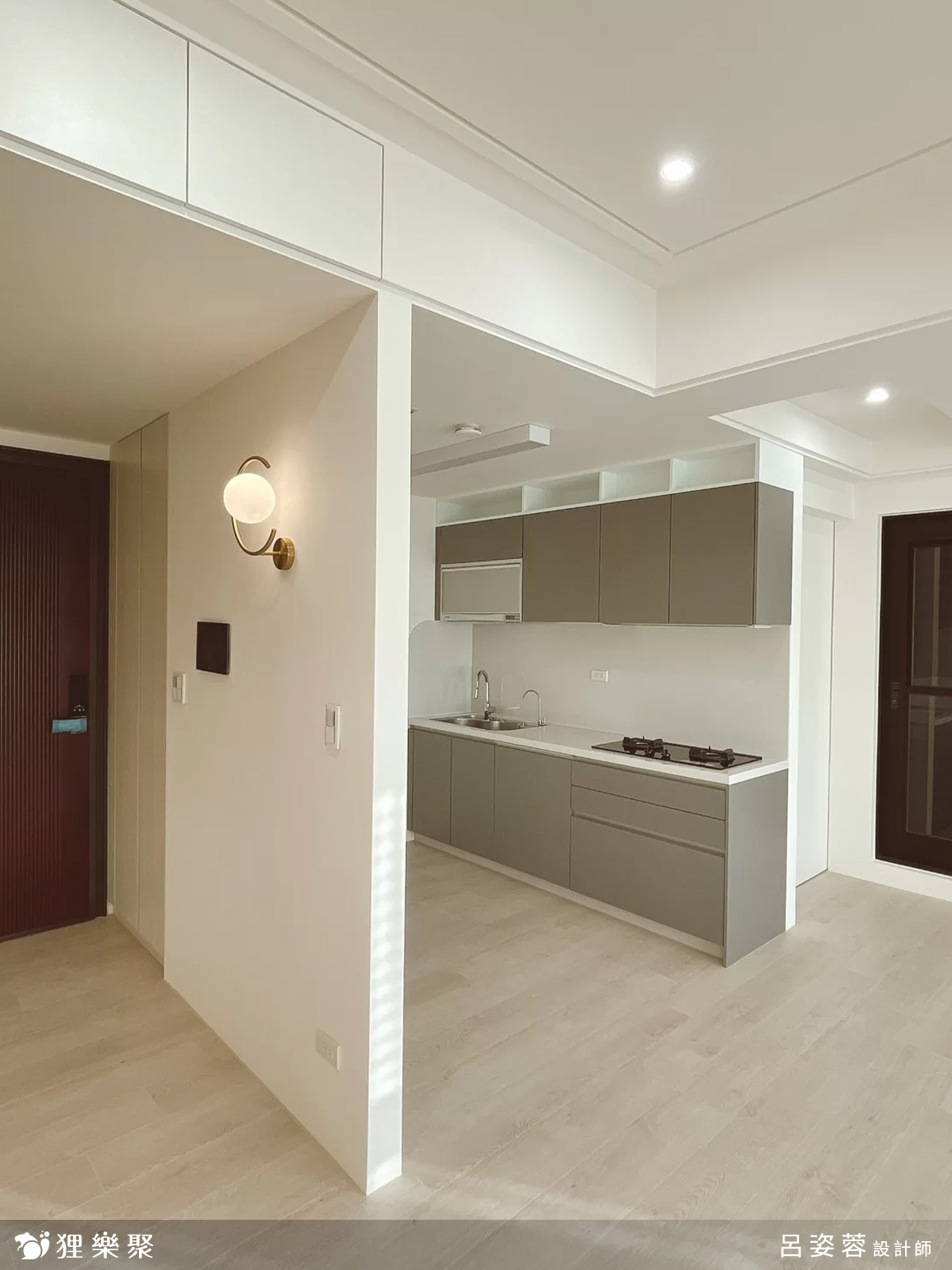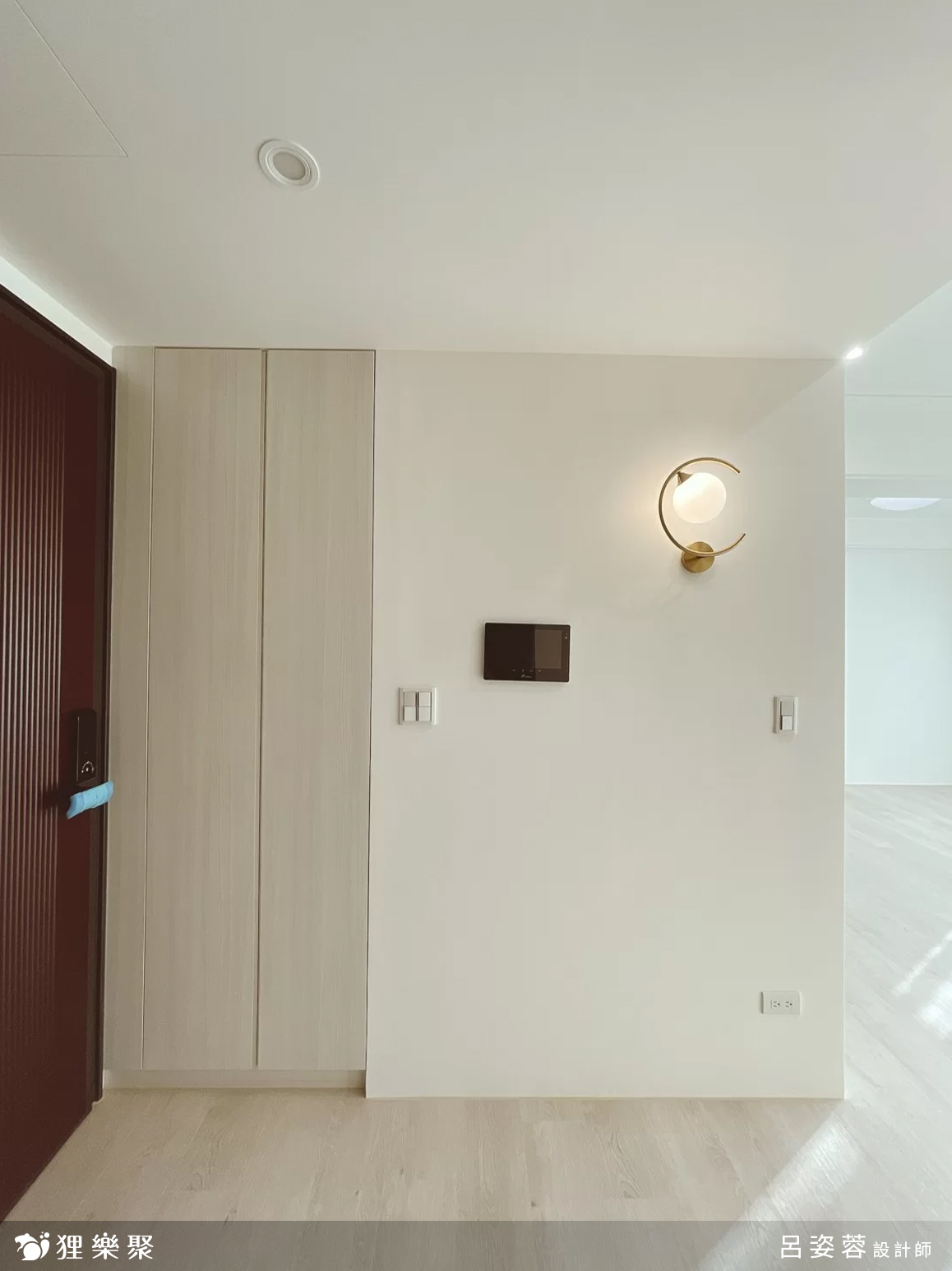 燈具配置上,設計師以基本的嵌燈做為基礎照明,客廳及廚房再各加入一盞吸頂燈帶來充足的光線,而玄關區域則選擇了特色壁燈,若是家人晚回家,可以替對方留一盞小燈,是同時具備絕佳視覺效果及功能性的壁燈。