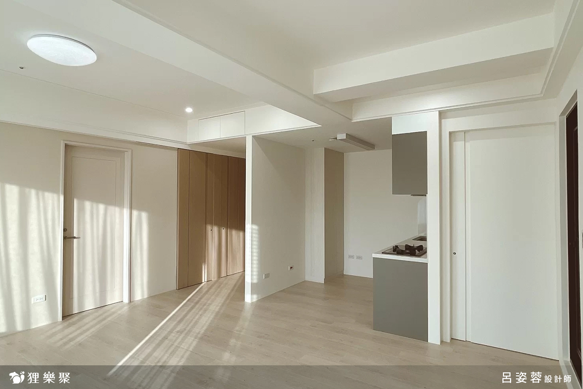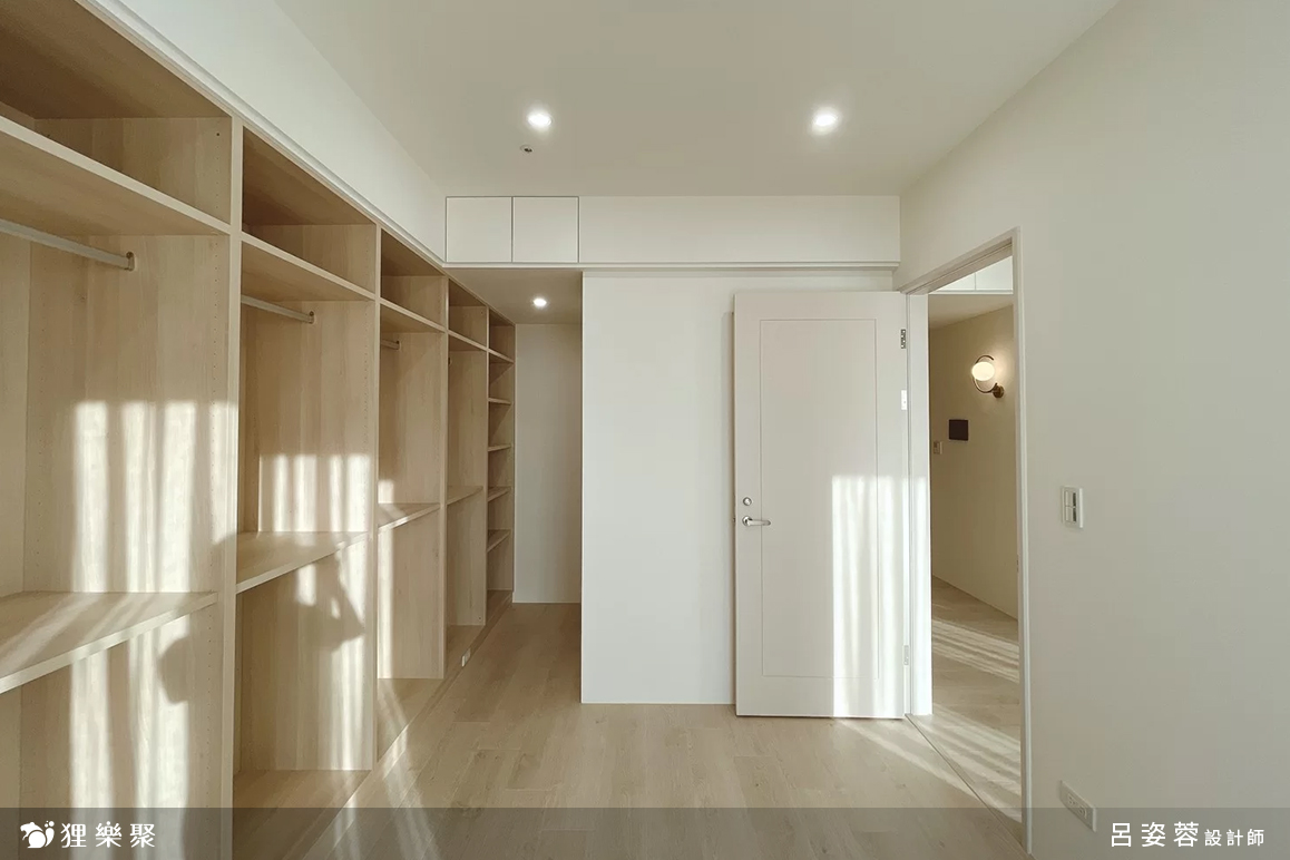 由於坪數並不是很大,設計師選擇在公共空間僅規劃少量的高櫃(如:玄關鞋櫃),其他需要的家具可以再挑選日系的風格櫃來搭配,讓整體空間感不會過於壓迫,而廁所則以隱藏門做修飾,讓廁所的入口彷彿只是一排收納櫃,視覺上更加簡約;廁所入口旁的房間則規劃為更衣間,全數為開放式的櫃體,讓屋主在挑選衣物時可以一目瞭然。延伸閱讀:<< 臥室設計秘訣:如何裝潢實用和美感平衡的房間 >>